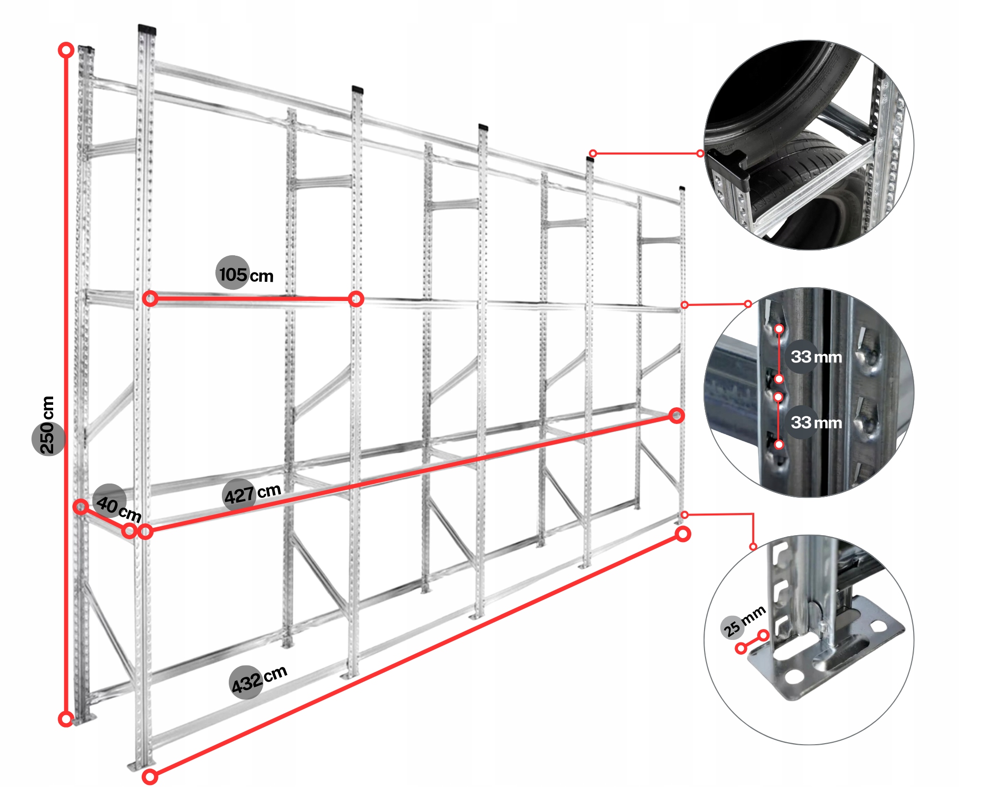 Відстань між перфораціями кожні 33 мм, що дає можливість регулювати висоту рівнів зберігання відповідно до розміру шин/колес, причому максимальна відстань між рівнями становить 70 см.