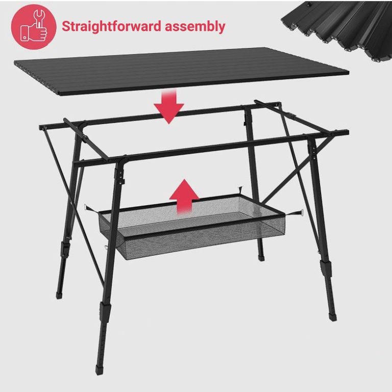 Цей стіл для кемпінгу з сумкою, що регулюється по висоті, виготовлений із надзвичайно міцного алюмінієвого сплаву та є супутником у подорожах, навіть коли ви подорожуєте з одного кемпінгу в інший. Він уже достатньо міцний, щоб витримувати повсякденні навантаження на вулиці, а доглядати за ним так само просто, як вологою ганчіркою. Робоча поверхня столу оснащена додатковою сіткою і пропонує багато місця для будь-яких цілей, а сітчасте кріплення вміщає все необхідне. Його можна розмістити будь-де - в саду, на пляжі або в кемпінгу. Ці складані столи чудово підходять для приготування їжі, їжі та навіть для роботи.