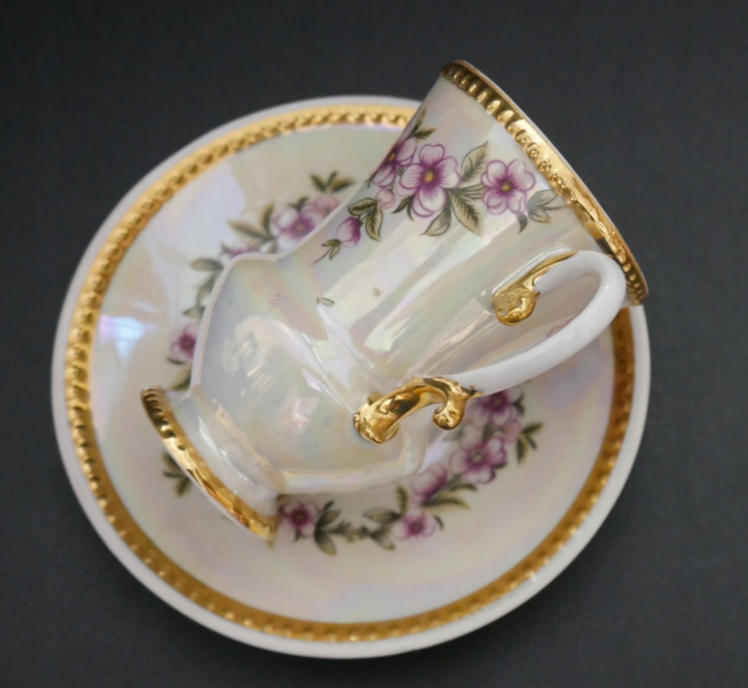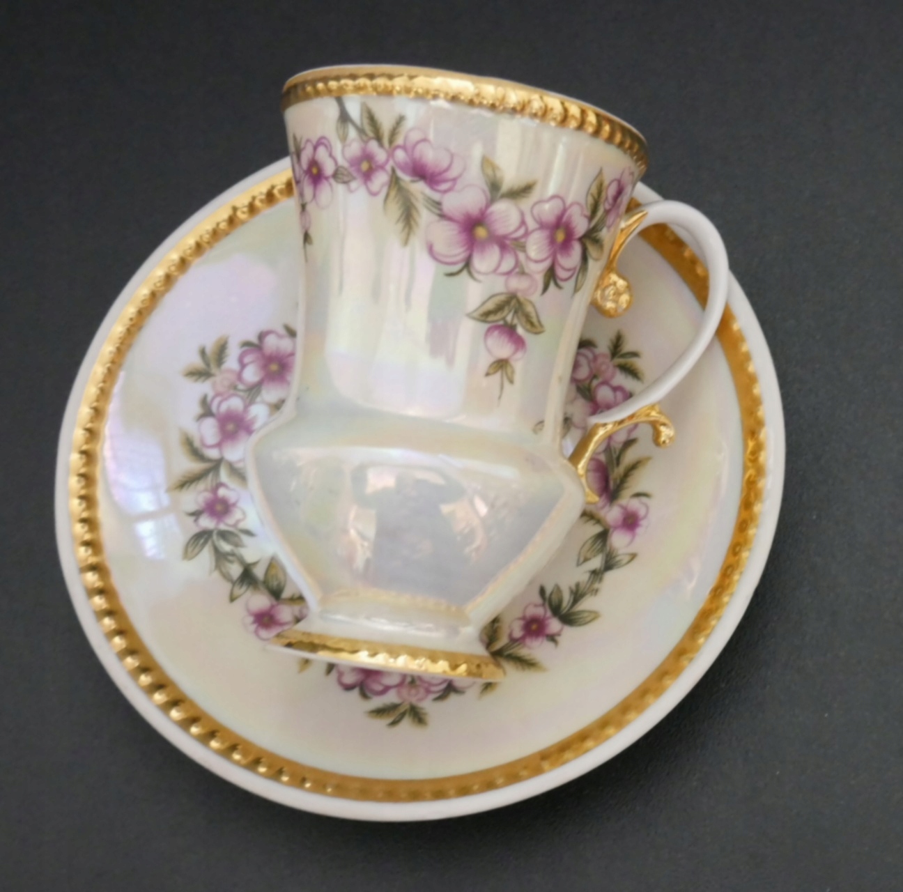 біла порцеляна, легка, тендітна, зовні райдужна, позолочена