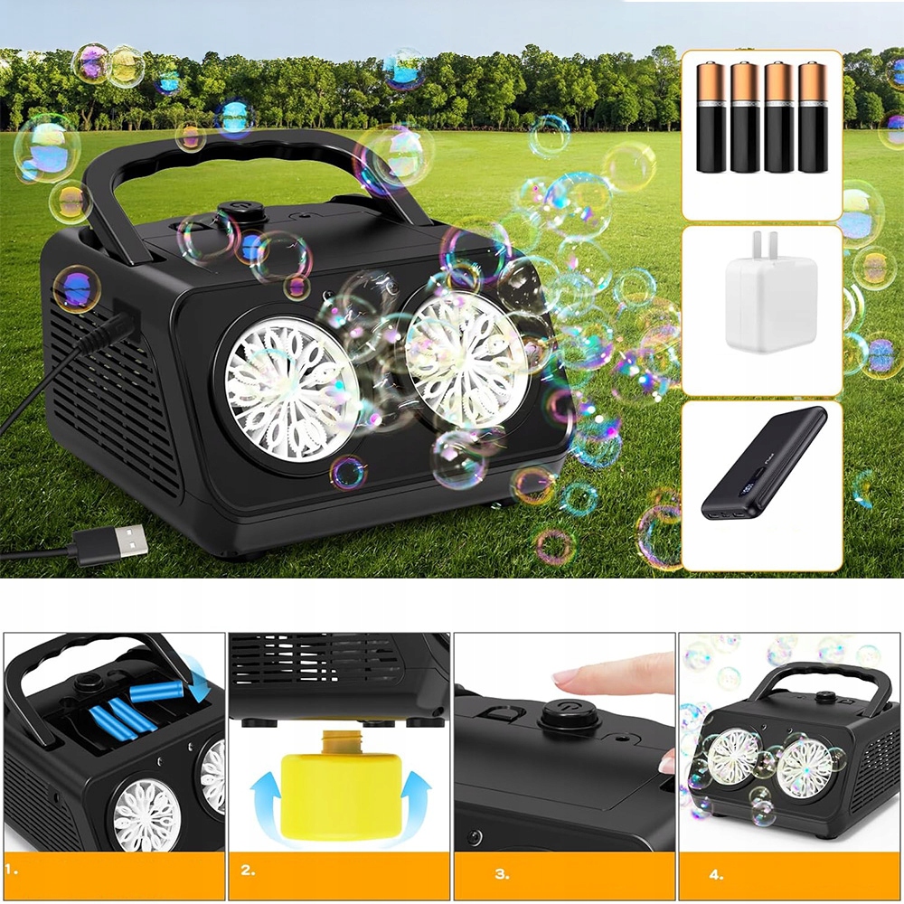 У наш генератор мильного міхура є портативна ручка, щоб ви могли взяти її з собою, куди б ви не пішли. Генератор мильних міхурів працює від зарядки USB або 4 батарейних батарей (не входить). Це забезпечує максимальну зручність, що дозволяє насолоджуватися генератором мильного міхура як у приміщенні, так і на відкритому повітрі. Він може бути використаний для ділових цілей, що підходить для днів народження, сімейних зустрічей та шоу в басейні.