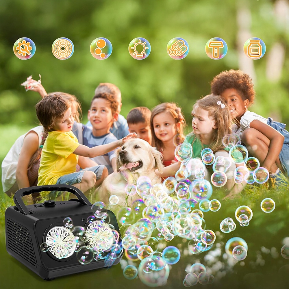 мильна бульбашкова машина - ідеальна іграшка на вулиці на галявині, дворі, пляжі, до парку, до парку, до парку, до Кемпінг, для гриля тощо. Це довговічна і довга машина для мильних бульбашок для тих, хто шукає смішного та безпечного вибору бульбашкової машини мир. Це також чудова ідея подарунка для маленьких дітей, дітей та домашніх тварин. Діти можуть грати з мильними бульбашками в будь -який час у парках, дворі, пляжах, кемпінгу, дитячих майданчиках та газонах.