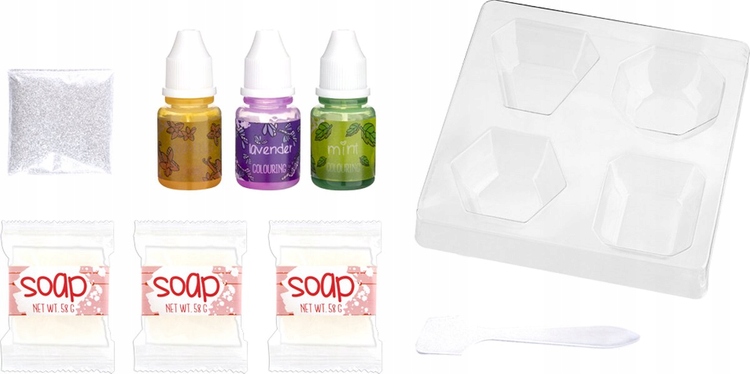 Набір для самосробних мила буде стимулювати вашу уяву та творчість. Завдяки цьому набору ви створите прекрасні мила. м'ятний аромат; Ванільний аромат; 3 базові мило для 56 г; силіконові форми; Срібна упаковка, шпатель.