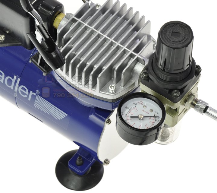 Мембранний редуктор, оснащений манометром, дозволяє точно регулювати тиск. Ребриста головка покращує охолодження. Гумові ніжки зменшують передачу вібрацій під час роботи компресора та запобігають його переміщенню.