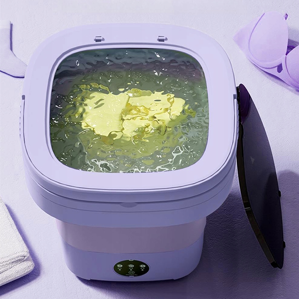 Невелика портативна пральна машина має продуману складану конструкцію для зручного зберігання, легко поміщається між полицями або під ліжком, не займаючи надто багато місця у вашому домі.
