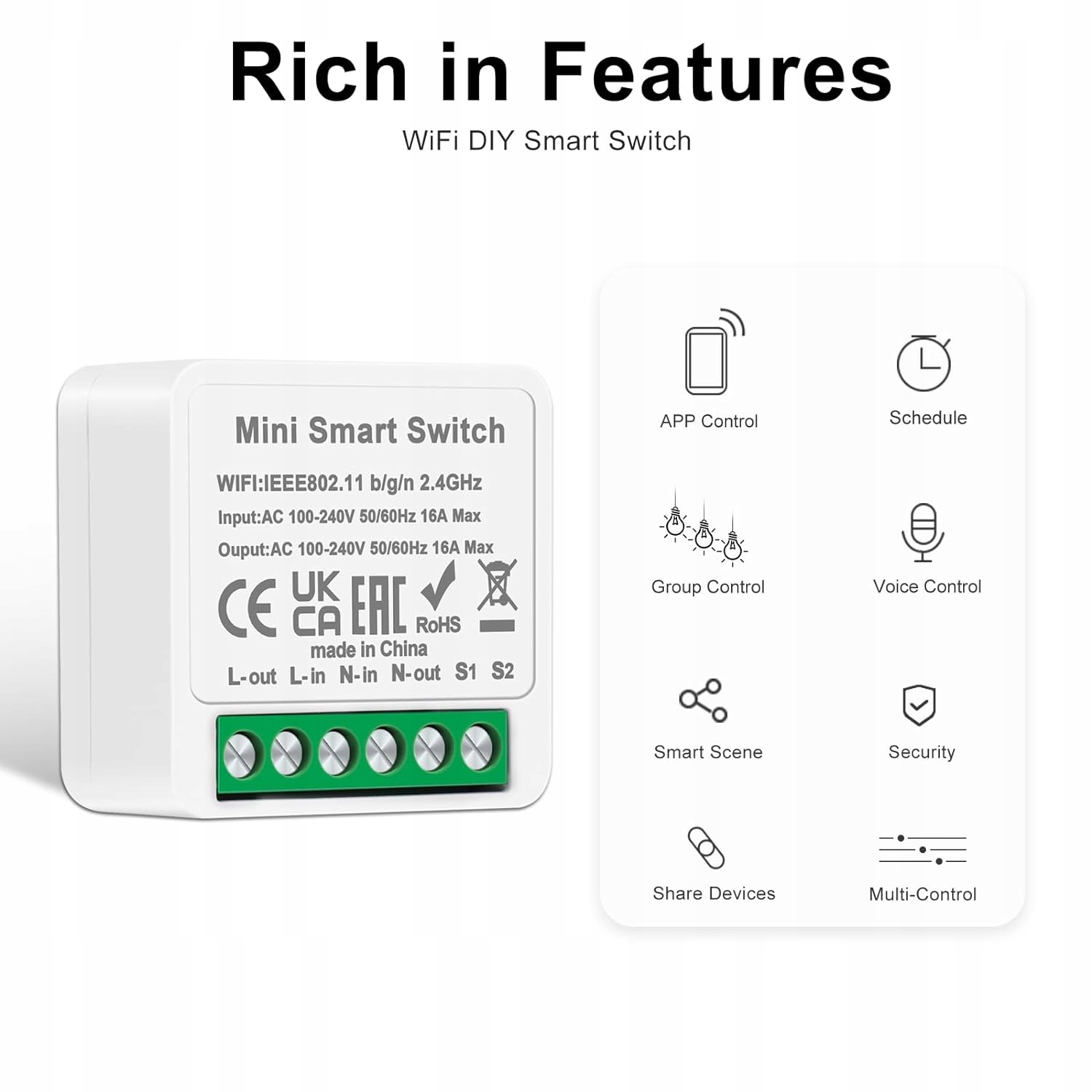 - Дизайн і встановлення: Модуль розумного вимикача з міні-дизайном (4,0 × 4,0 × 2,0 см) можна вставити в оригінальний настінний вимикач, який може перетворити гойдалку на розумний вимикач. Вхід і вихід: 100–240 В змінного струму, макс. 16 ампер. У програмі дозволено багато функцій, як-от B. Схвалення контролю, створення сцени, зворотний відлік, розклад часу тощо.