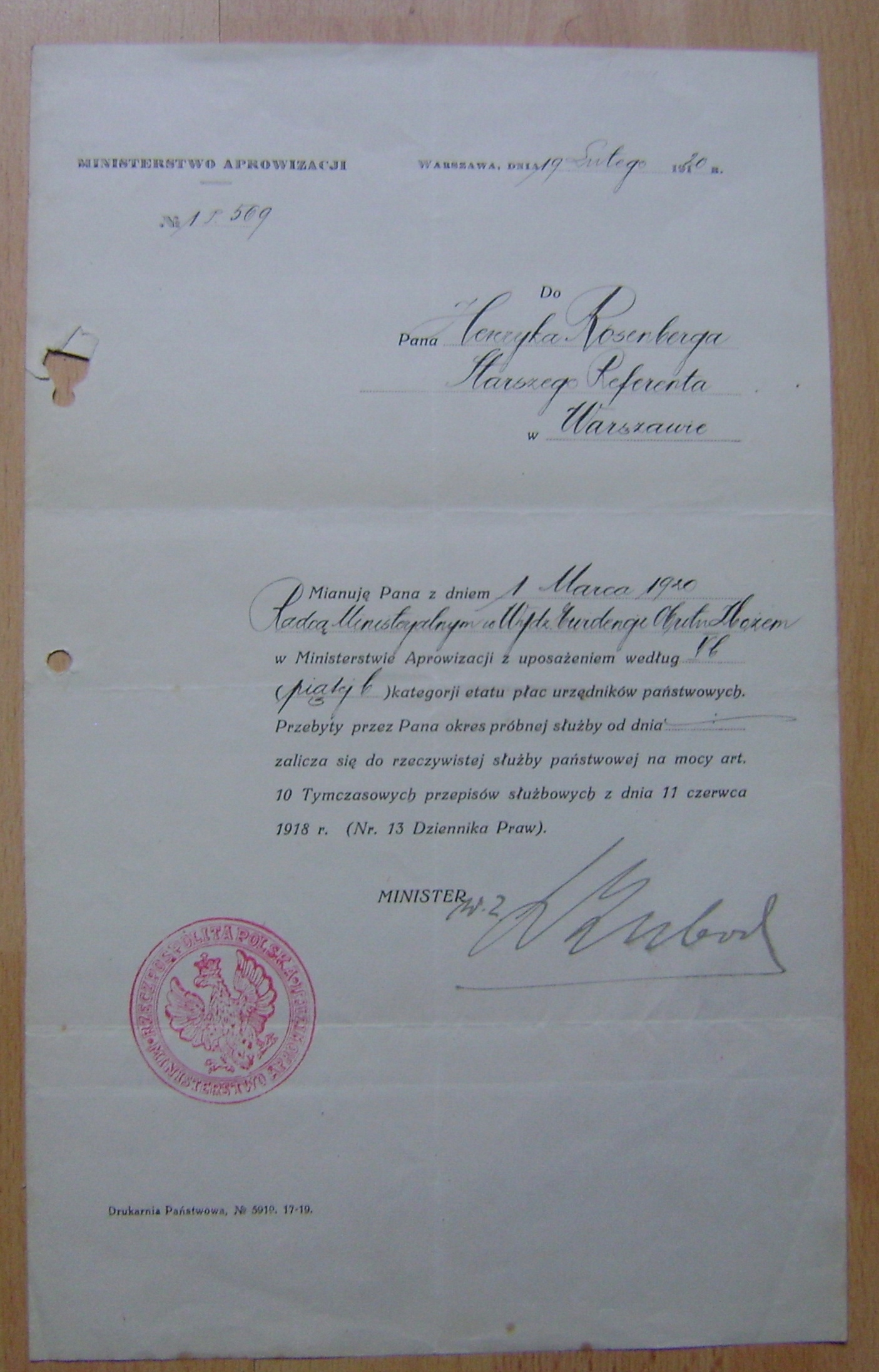 MINISTERSTWO APROWIZACJI -1920 rok dokument