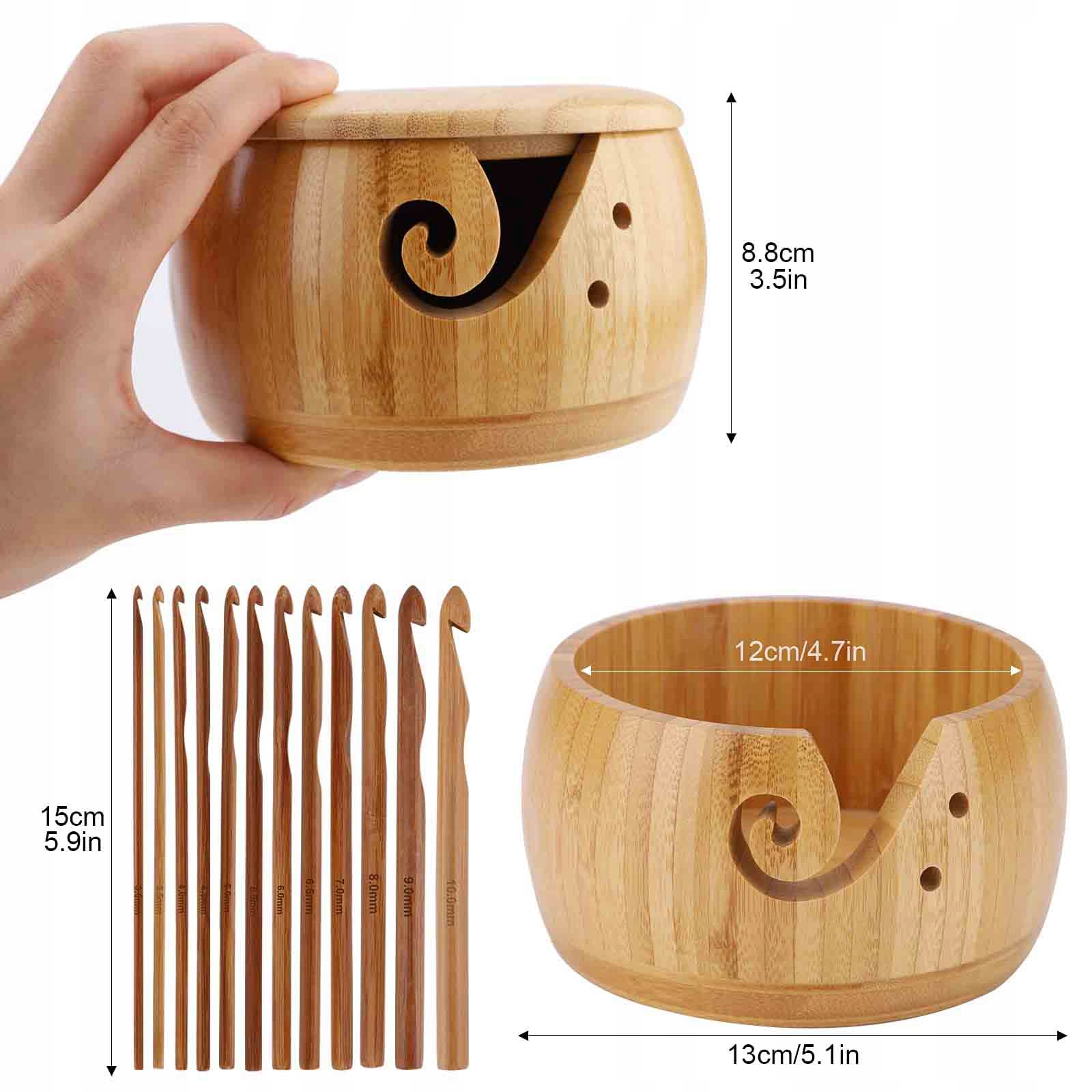 Розмір: Діаметр чаші для зберігання пряжі становить приблизно 15 см. Висота: 8 см, що дозволяє зберігати близько 1-2 мотків пряжі під час в'язання спицями або гачком. 12 гачків різних розмірів: 3 мм, 3,5 мм, 4 мм, 4,5 мм, 5 мм, 6 мм, 6,5 мм, 7 мм, 8 мм, 9 мм, 10 мм.
