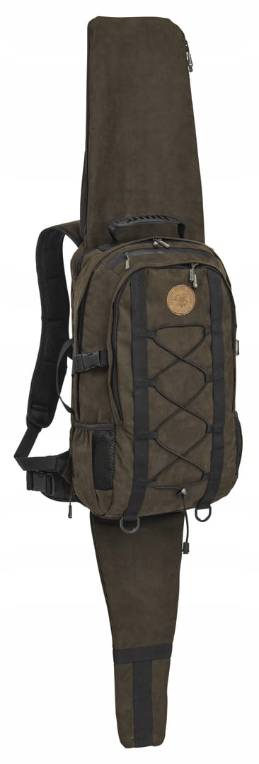 Практичний рюкзак для полювання Pinewood Hunting з ємність 22 л, виготовлена з водонепроникної штучної замші. Спинка рюкзака оббита м'якою сіткою, що забезпечує комфорт носіння. Рюкзак Pinewood Hunting має багато практичних і функціональних кишень, відділень і деталей, таких як: дві бічні кишені, передня кишеня з відділенням, напр. для пляшки з водою або термоса, D-кільця, водонепроникна кишеня, зручна ручка, м'які ергономічні та регульовані лямки, регульований та повністю знімний ремінь. Велике основне відділення містить окремі відділення для комп’ютера та подушки сидіння. У цьому відділенні також міститься сітчастий мішок, який можна прикріпити до D-подібних кілець на зовнішній стороні рюкзака та служити додатковим місцем для зберігання, наприклад, взуття чи впольованих птахів. Рюкзак також має вбудований чохол для зброї, який підходить для більшості моделей гвинтівок з прицілом (130 см), який можна скласти та зберігати в рюкзаку, коли він не використовується. Додаткова ручка, завдяки якій рюкзак можна носити горизонтально. Водонепроникне дно рюкзака було посилено, що робить його надзвичайно міцним. 100% поліестер, додаткова сумка 100% поліестер, накладка на сидіння 100% поліетилен.