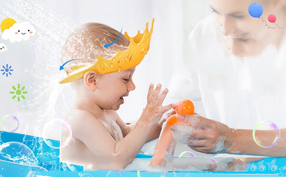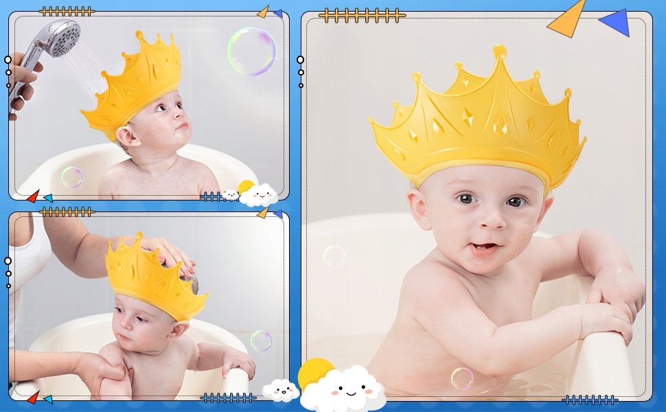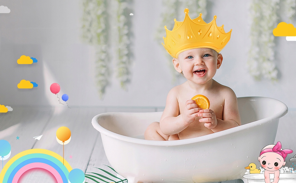 Шапочка для душу дитини, водонепроникна м’яка силіконова шапочка для душу дитини, регульована мила шапочка для душу у формі корони для дітей 0–9 років, захист для очей і вух (жовтий) p>