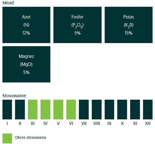 Склад: 12% (N), 5% (P2O5), 15% (K2O), 5% (MgO)