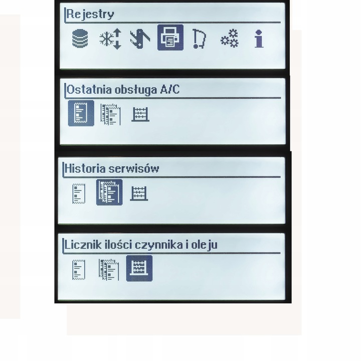 Меню «Реєстри» надає нам доступ до такої інформації, як: хід останнього обслуговування, повна історія обслуговування, лічильник кількості холодоагенту та масла (уся ця інформація також доступна в додатку OKSYGEN)
