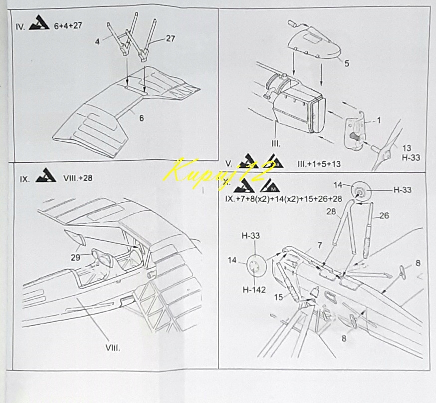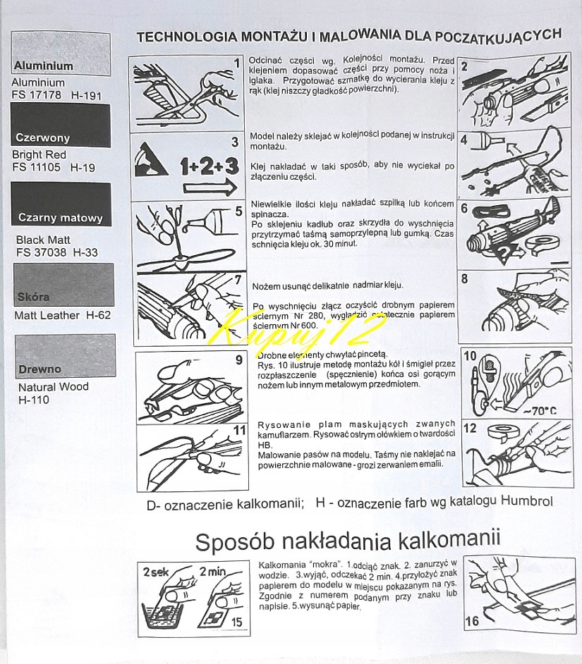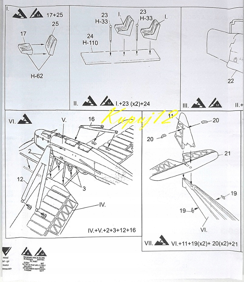 його слід пофарбувати 1- рази всі елементи, які будуть намальовані зовнішніми фарбами пізніше. Деякі елементи можуть вимагати фарбування перед склеюванням (наприклад, центр кабіни або елементи крил на кріпленні колеса).