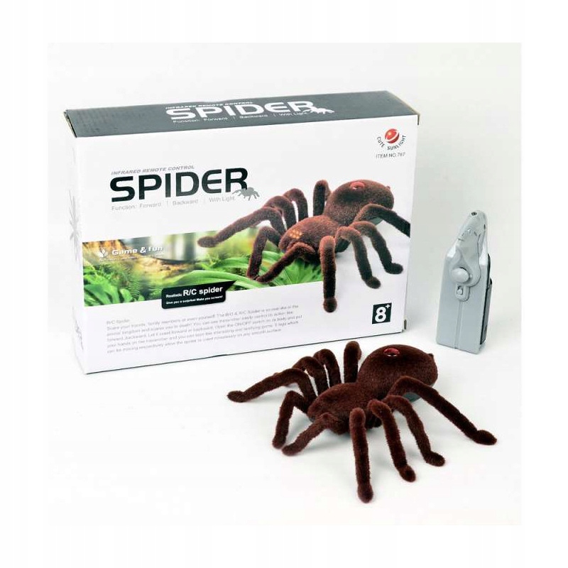 Великий волохатий павук, керований пультом дистанційного керування. Його дуже реалістична зовнішність буде налякати всіх ваших друзів. Він схожий на справжню тарантулу. Вершник контролюється пілотом, що працює на батареї 2 1,5 В AAA (вони не включені). Дозволяє направляти павука вперед, назад і повернути ліворуч