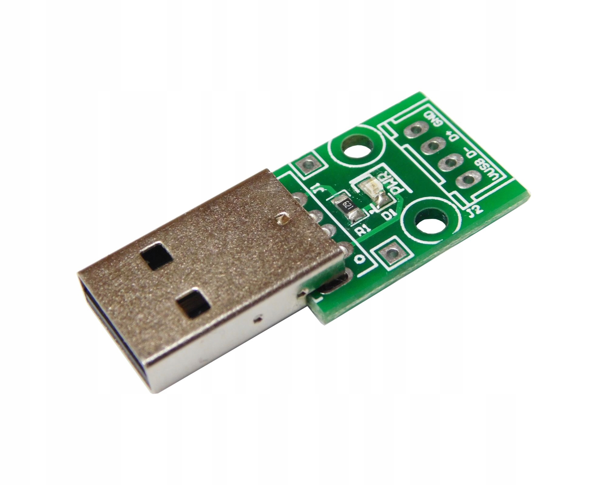 Адаптер-перехідник, штекер USB A (штекер) на контактний роз’єм із золотим контактом (2,54 мм) для макетних плат, універсальних роздруківок або для спаювання проводів. Синій світлодіодний індикатор живлення USB 5 В.