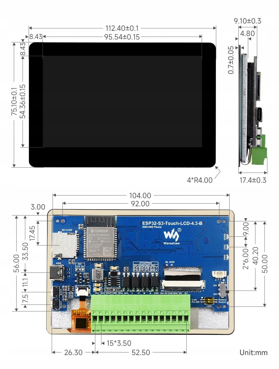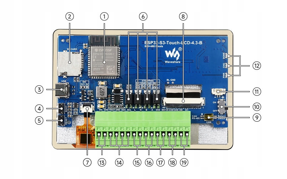 esp32-S3-touch-lcd-4.3b -це вдосконалена пластина розробки , оснащена двоядерною 32-бітною LX7 та підтримкою wifi 2,4 ГГц і Bluetooth 5 , що робить це чудовим вибором для програми IoT, інтелектуальних проектів будинку та HMI . Завдяки 4,3-дюймовому екрану ємності з роздільною здатністю 800 × 480 пікселів , пристрій дозволяє зробити зручну та плавну роботу графічних інтерфейсів. У флеш -пам'яті (8 Мб) та PSRAM (8 Мб) Підтримують розширені програми та численні роз'єми, такі як CAN, RS485, I2C та ізольовані входи/виходи/виходи, Широкий діапазон застосувань.