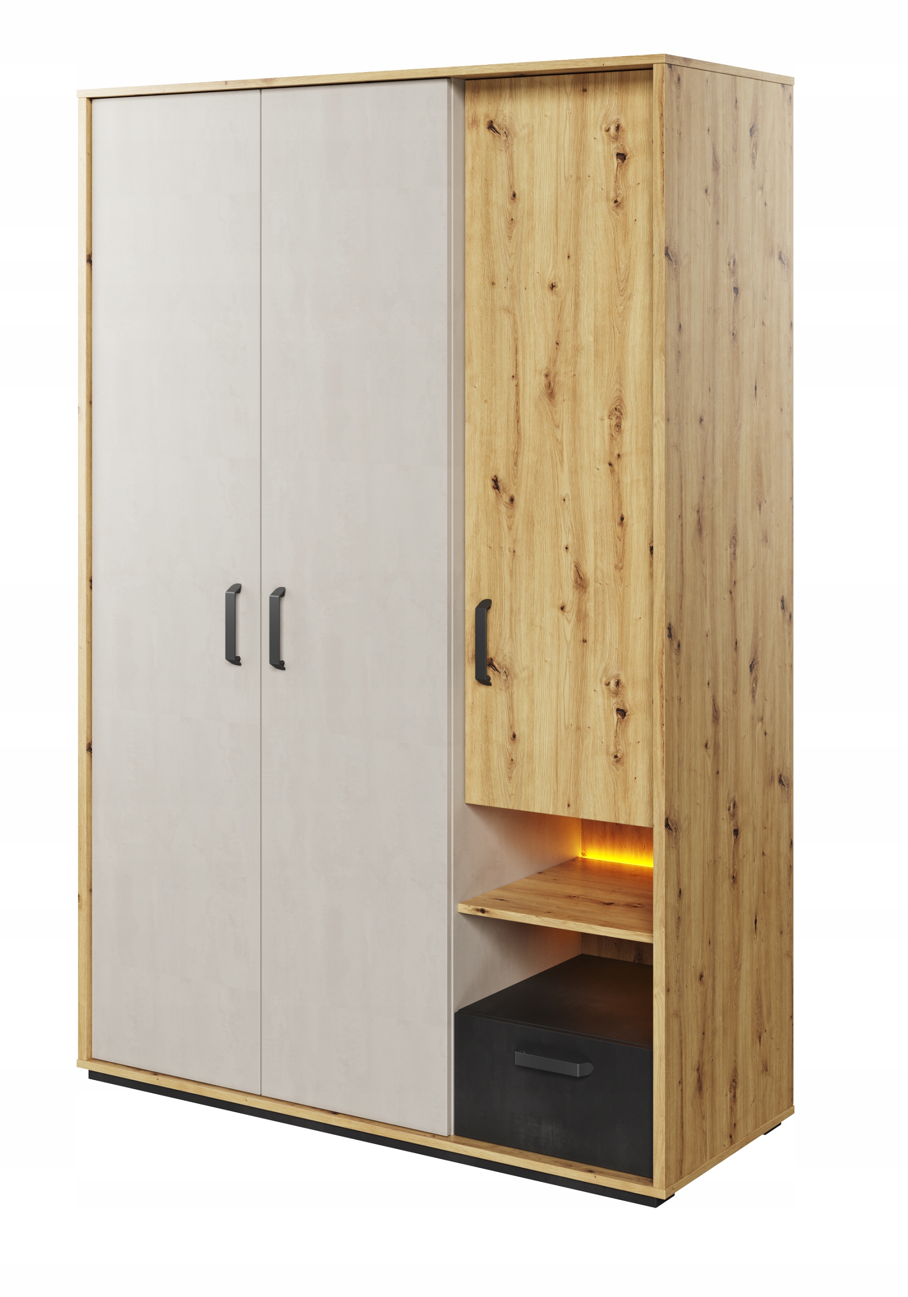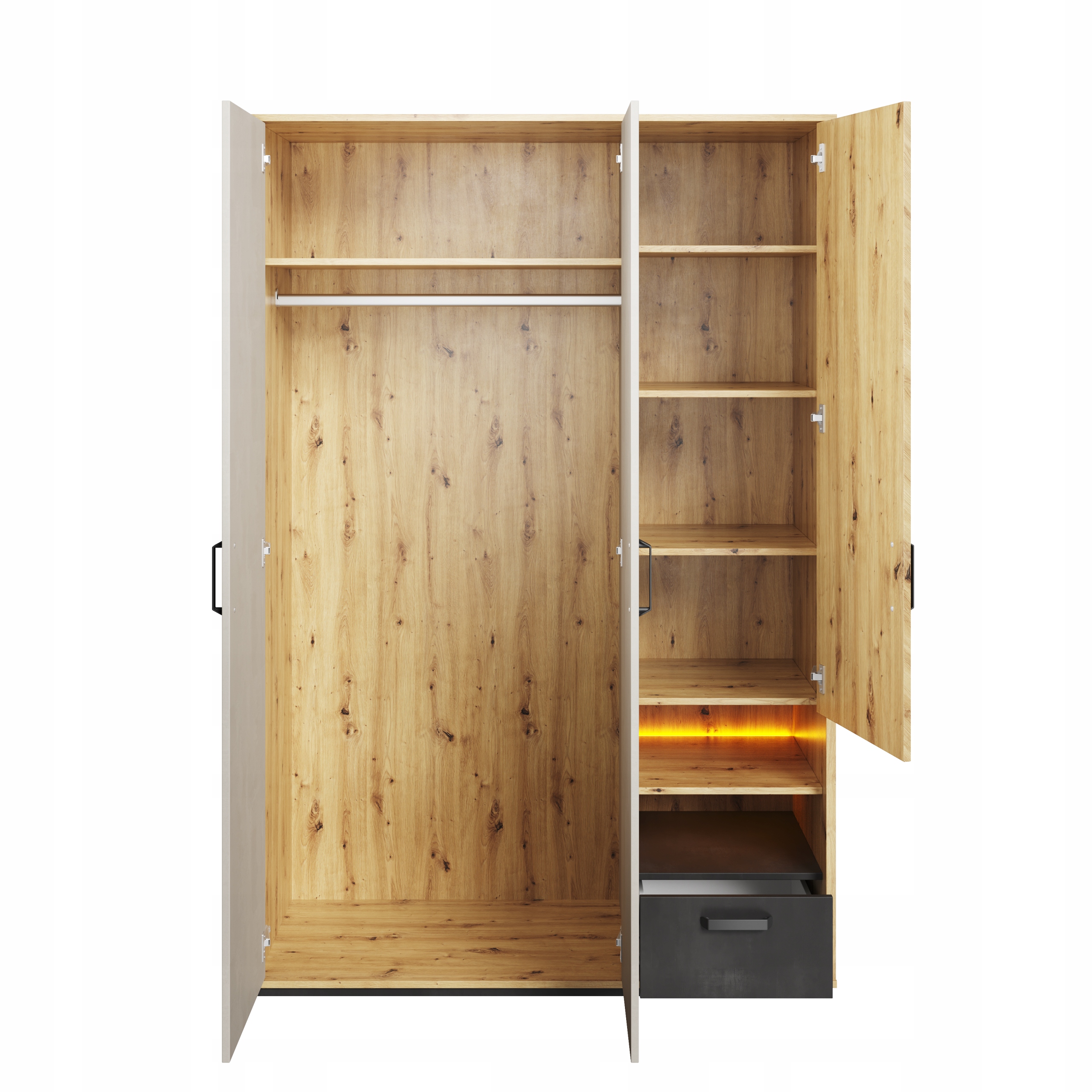 Тридверний гардероб оснащений довгою паличкою одягу та просторою полицею. Окрема частина має шельф -шельф і легко доступний ящик. Розміри