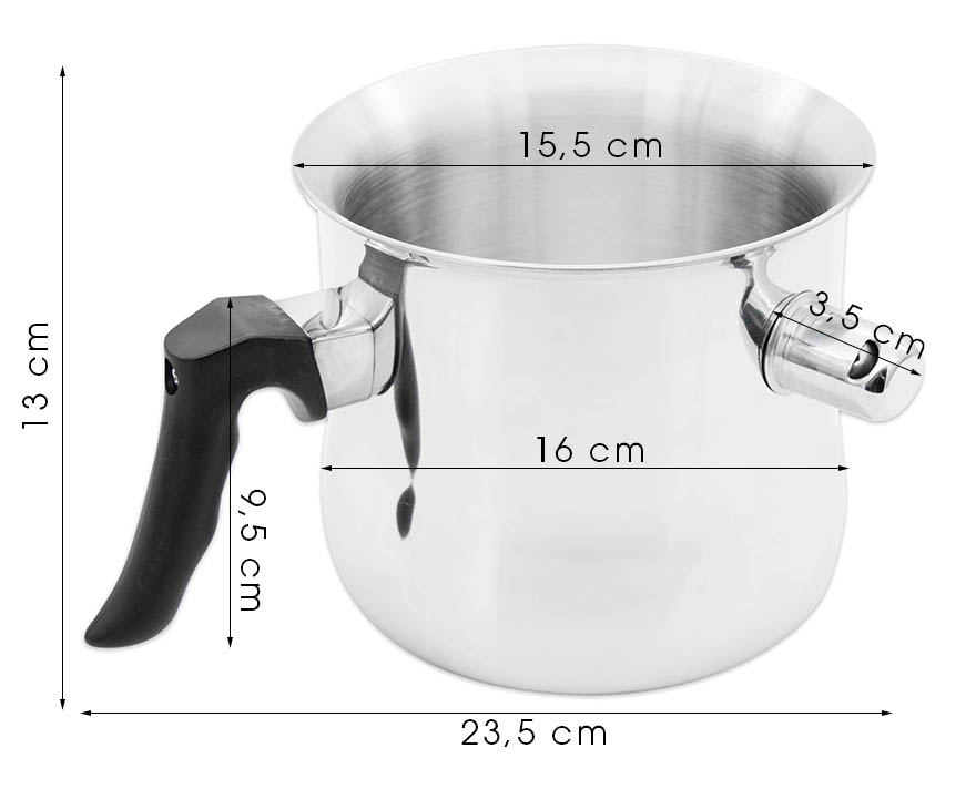 Виготовлений з високої якості нержавіючої сталі забезпечує багаторічну довговічність та витонченість. Глечик допомагає готувати молоко, робити смачні соуси, розчиняти шоколад або розтоплений сир. Різниця між молочним глечиком і звичайним горщиком лежить у подвійних стінках, між якими виливається вода, завдяки якому це запобігає спалюванню готових харчових продуктів .