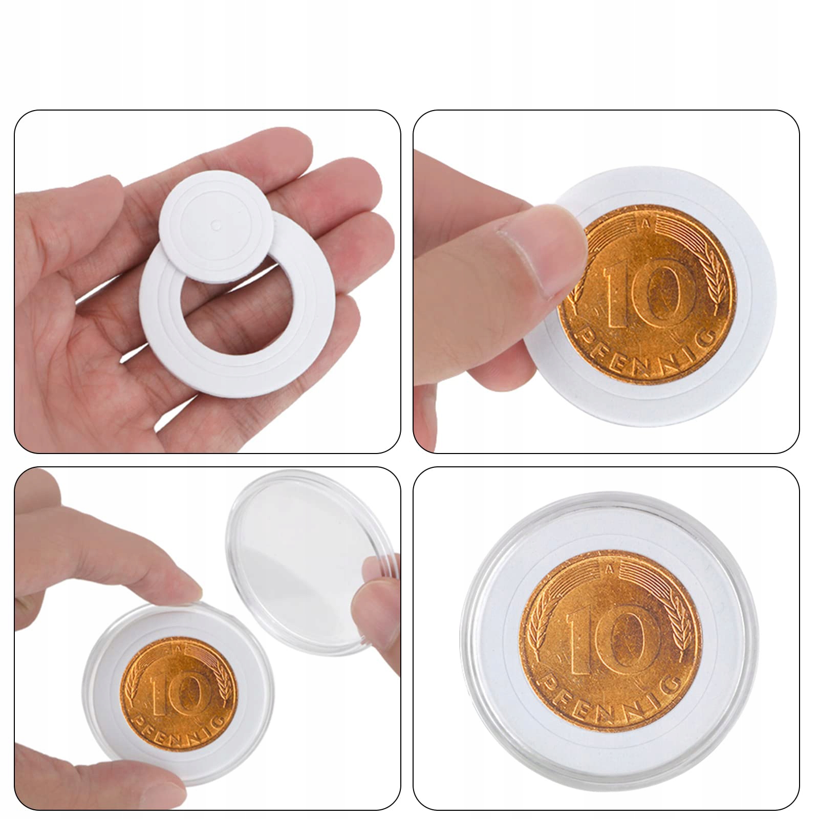 Регульовані печатки EVA: коробка для зберігання монет містить 100 відповідних печаток EVA. Кругле та зносостійке внутрішнє кільце EVA регулюється, тому його можна розрізати на 18 мм/21 мм/25 мм/27 мм/30 мм відповідно до розміру вашої монети. Це утримує монети на місці та запобігає їх ковзанню та подряпинам.