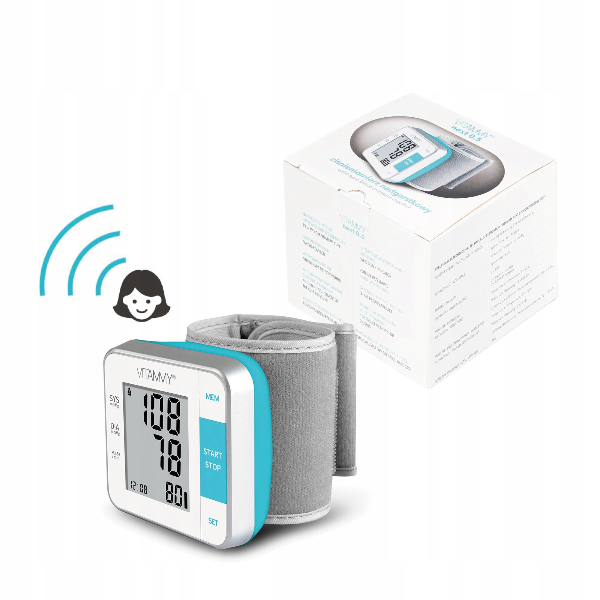 VITAMMY Next 0,5 voice to: Голосова функція, Універсальна манжета для зап'ястя, Виявлення аритмії, Інтерпретація результатів за шкалою ВООЗ, Середнє значення останніх 3 результатів, Автоматичне вимірювання артеріального тиску та частоти серцевих скорочень на зап'ясті, Висока точність, Пам'ять Функція до 120 вимірювань для двох осіб , Автоматичне вимикання, Дисплей показує поточний час, Індикатор рівня заряду батареї, Жорсткий футляр у комплекті.