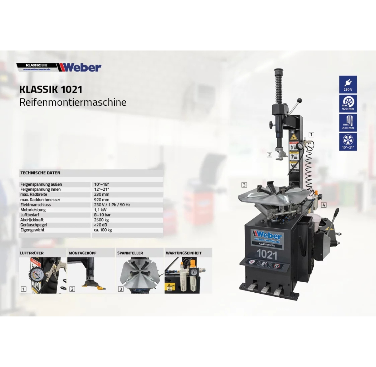 Монтажна машина для пасажирських автомобілів 12–21 ″ 230V Weber Classic Series 1021