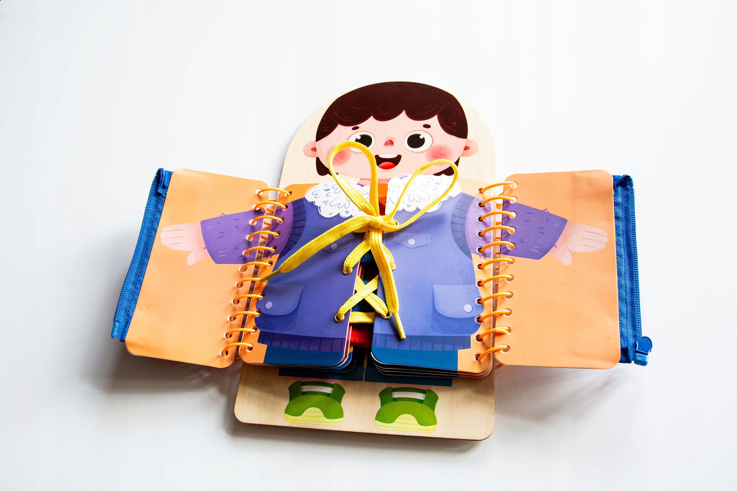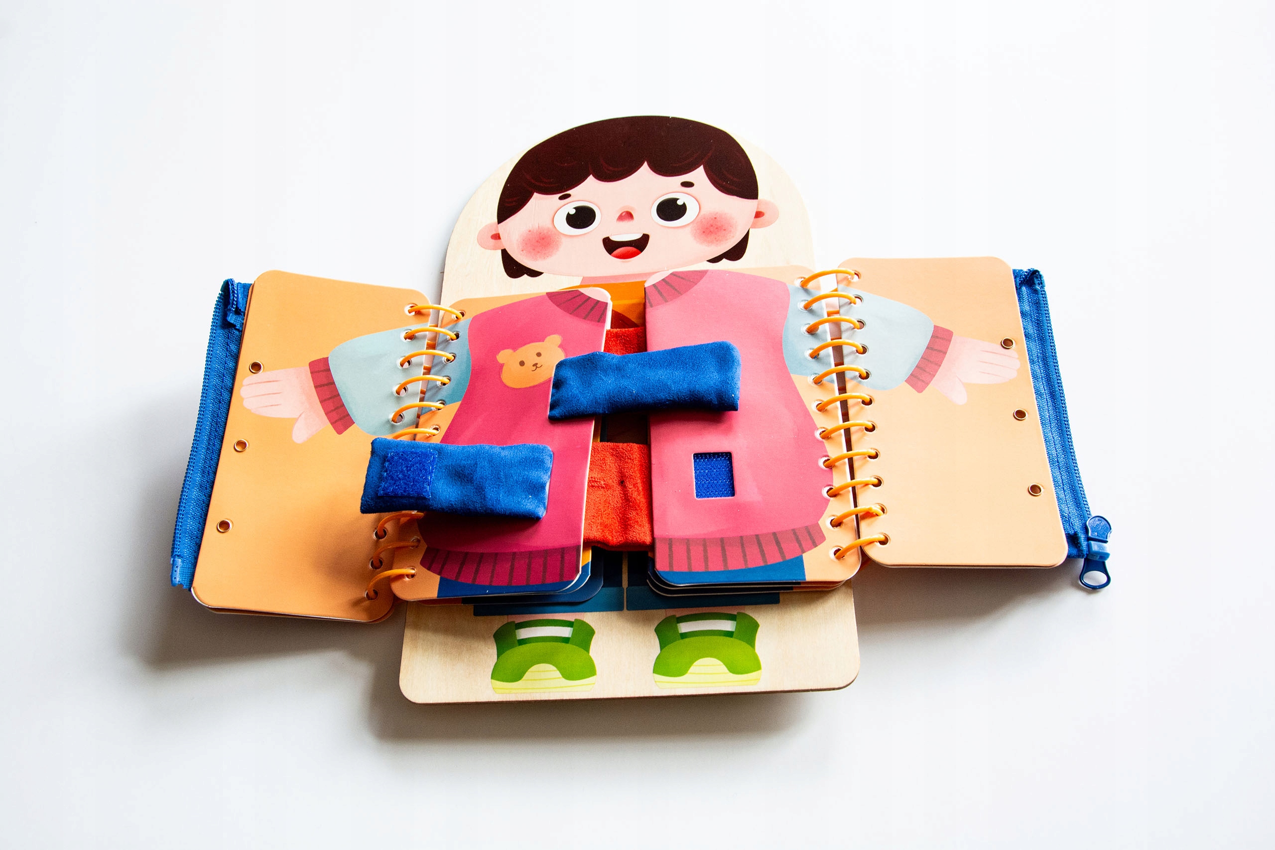 Книга-маніпулятор — чудова навчальна іграшка для вдосконалення навичок рук вашої дитини. Її основа виготовлена з дерева та кольорових сторінок з жорсткого картону. На ній зображена фігурка дитини, яку потрібно одягнути.