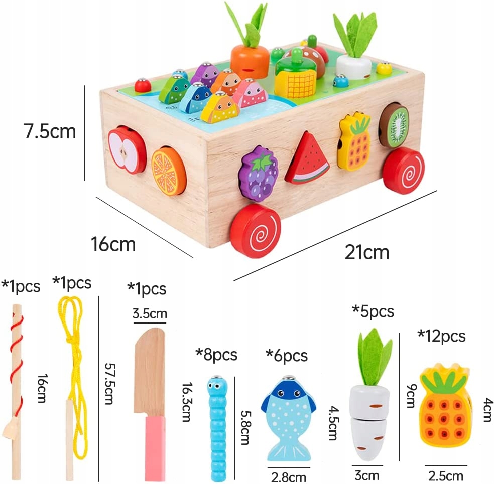 - Іграшка 7 в 1: сіяти овочі, різати фрукти, ловити рибу, ловити комах, створювати пари, протягувати нитку, смикати.