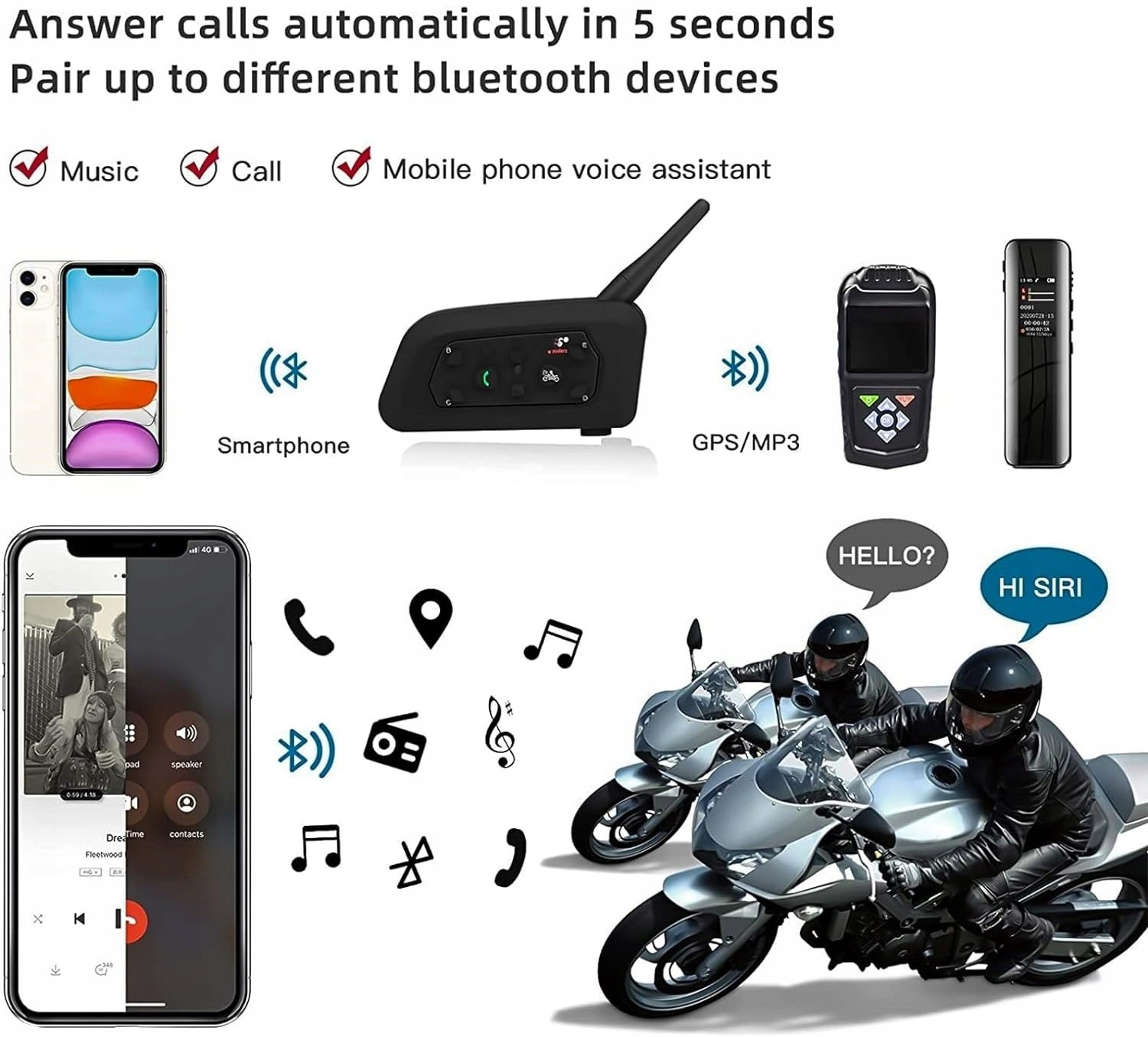- Бездротовий домофон Bluetooth створює зв’язок між окремими водіями, велосипедистами на відстані приблизно 1200 м (1312 ярдів)