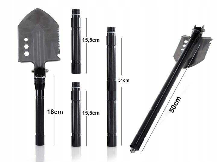Ніж можна розташувати в кожному елементі рукояті, а лопату можна притягнути тільки до першого елемента (без різьби, що стирчить).