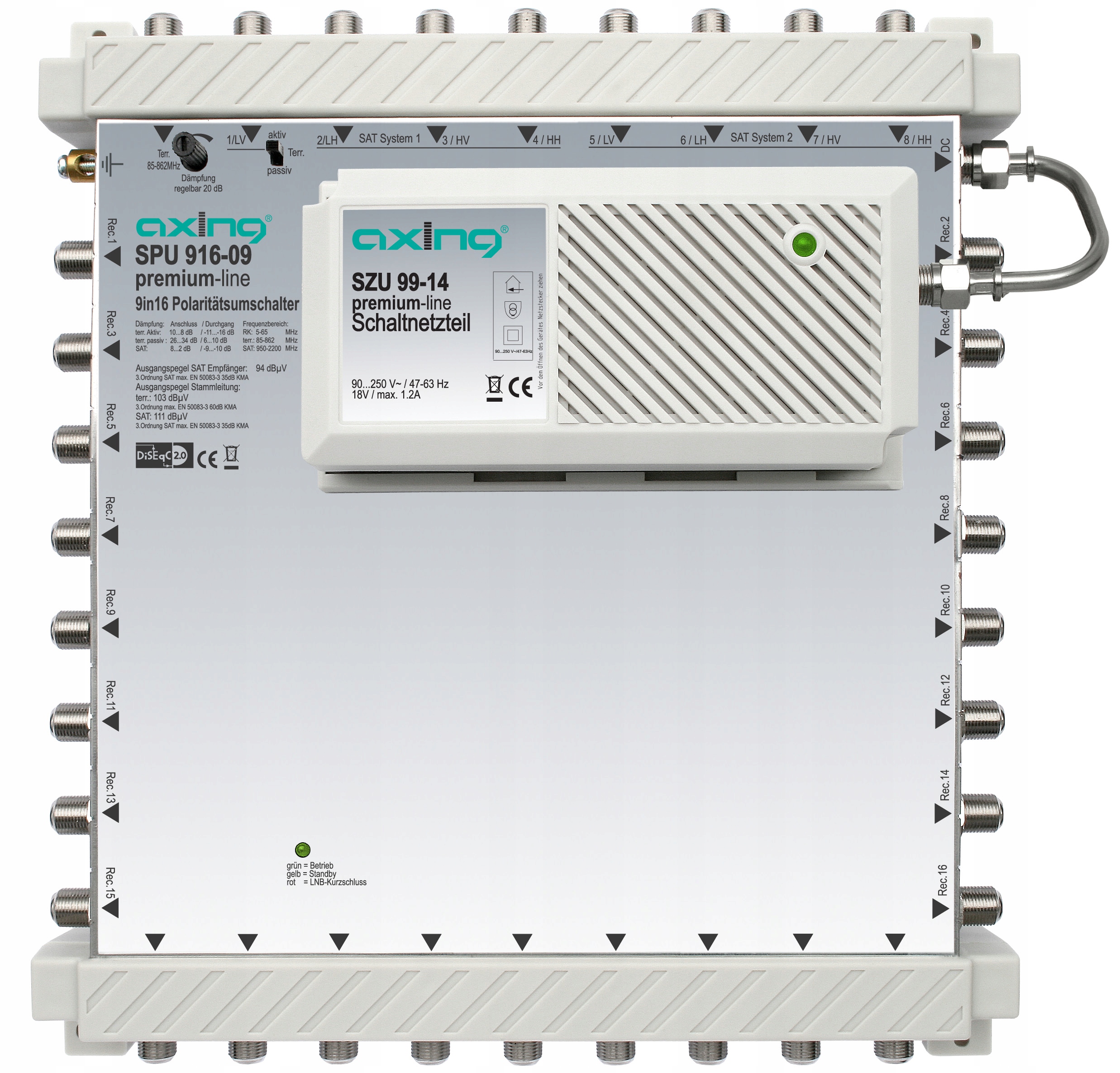 Каскадний мультисвіч 9 входів, 16 виходів, з тракт активного ефірного телевізійного сигналу та супутникового SPU 916-09 AXING