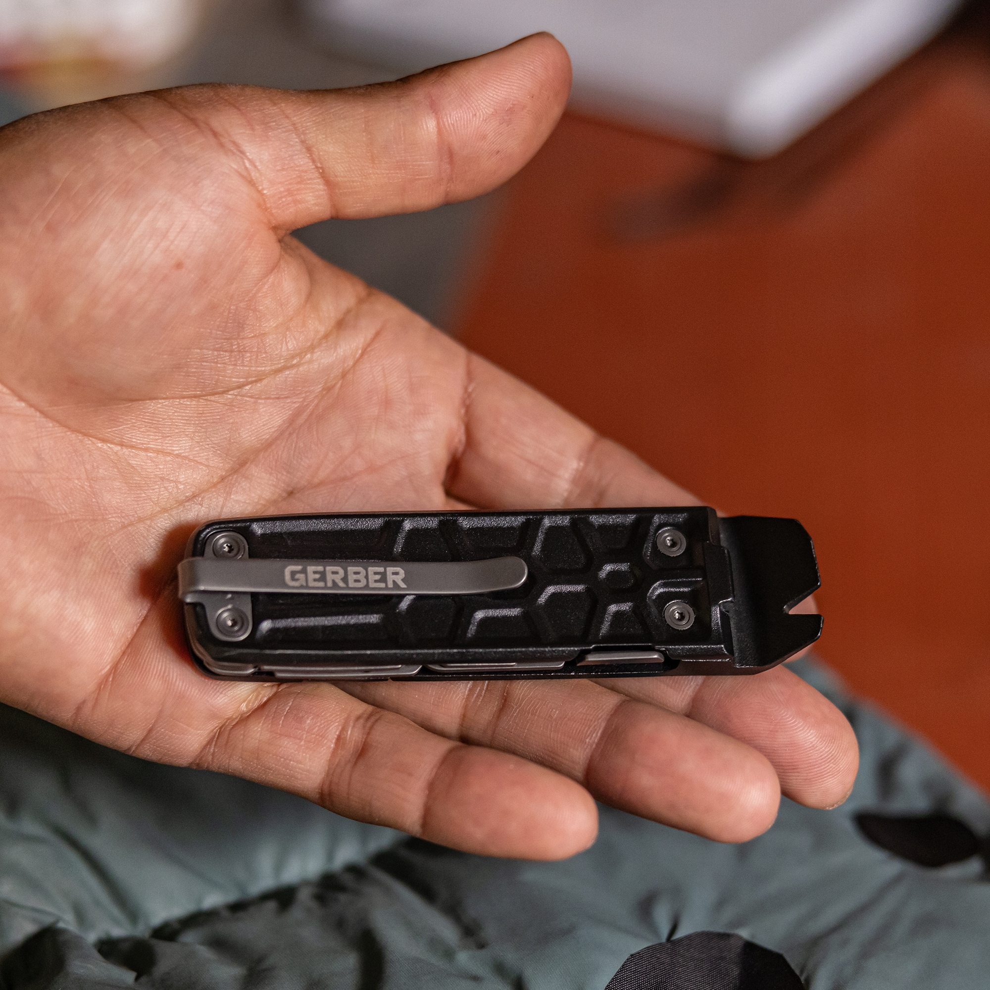 оснащений глибоким затискачем для кишень для зручного носіння. Зважування 113 g і вимірювання 9,8 см після складання він охоплюється 25 років захисту продукту Гербер.