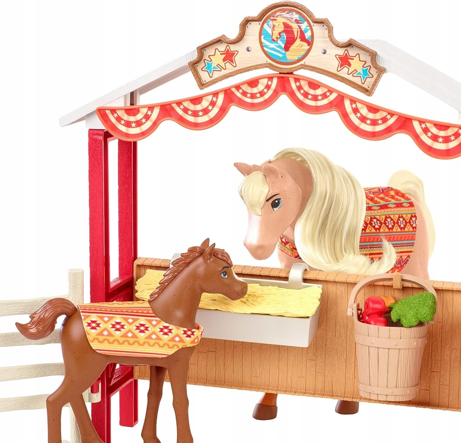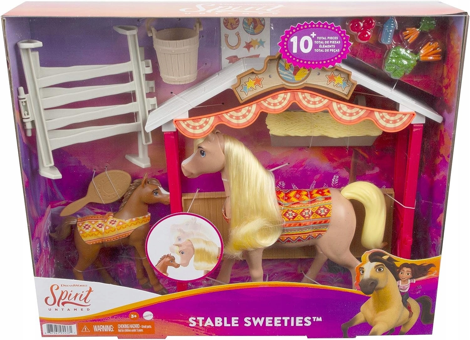 Станьте частиною дружби, хоробрості та пригод з анімаційним фільмом DreamWorks «Неприборканий дух». Діти можуть навчитися доглядати та годувати коней за допомогою набору Stable Treats. У ньому один кінь з довгою красивою гривою і рухомою головою і лоша. До кожного коня також додається різнокольорове покривало.