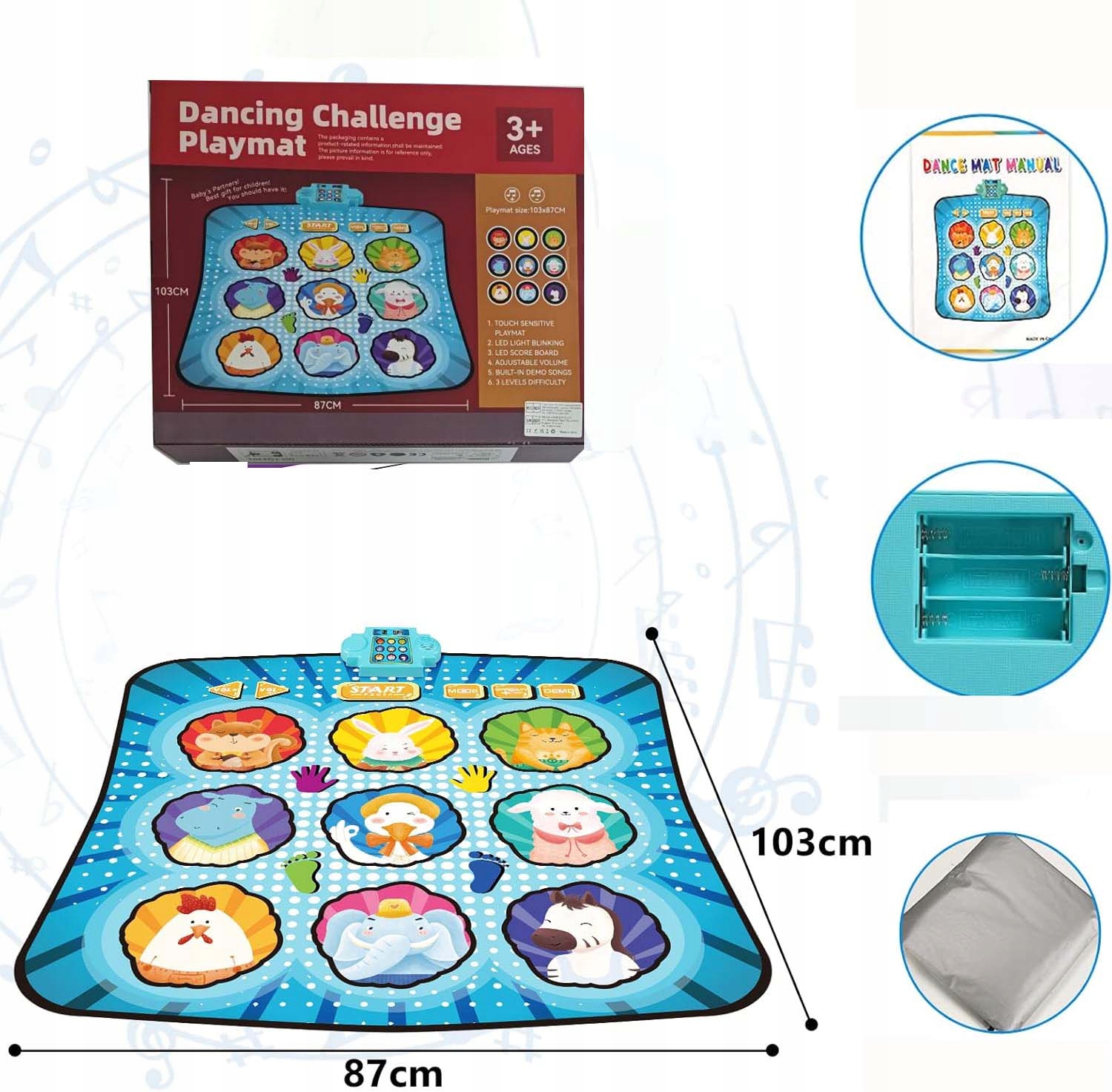 - - Дитячий танцювальний музичний килимок має 8 вбудованих музичних інструментів, 4 режими гри, 8 рівнів, 3 рівні складності, регульовану гучність < /li>