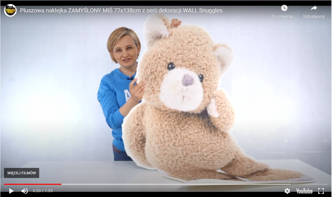 Подивіться у відео, чим вона відрізняється від звичайних фольгованих наклейок - гладка, тонка і холодна: https://www .wyborrodzicow.pl/nagzdrowie/8094,pluszowa-naklejka-zamyslony-mis-77x138cm-z-serii-dekoracji-wall-snuggles.html