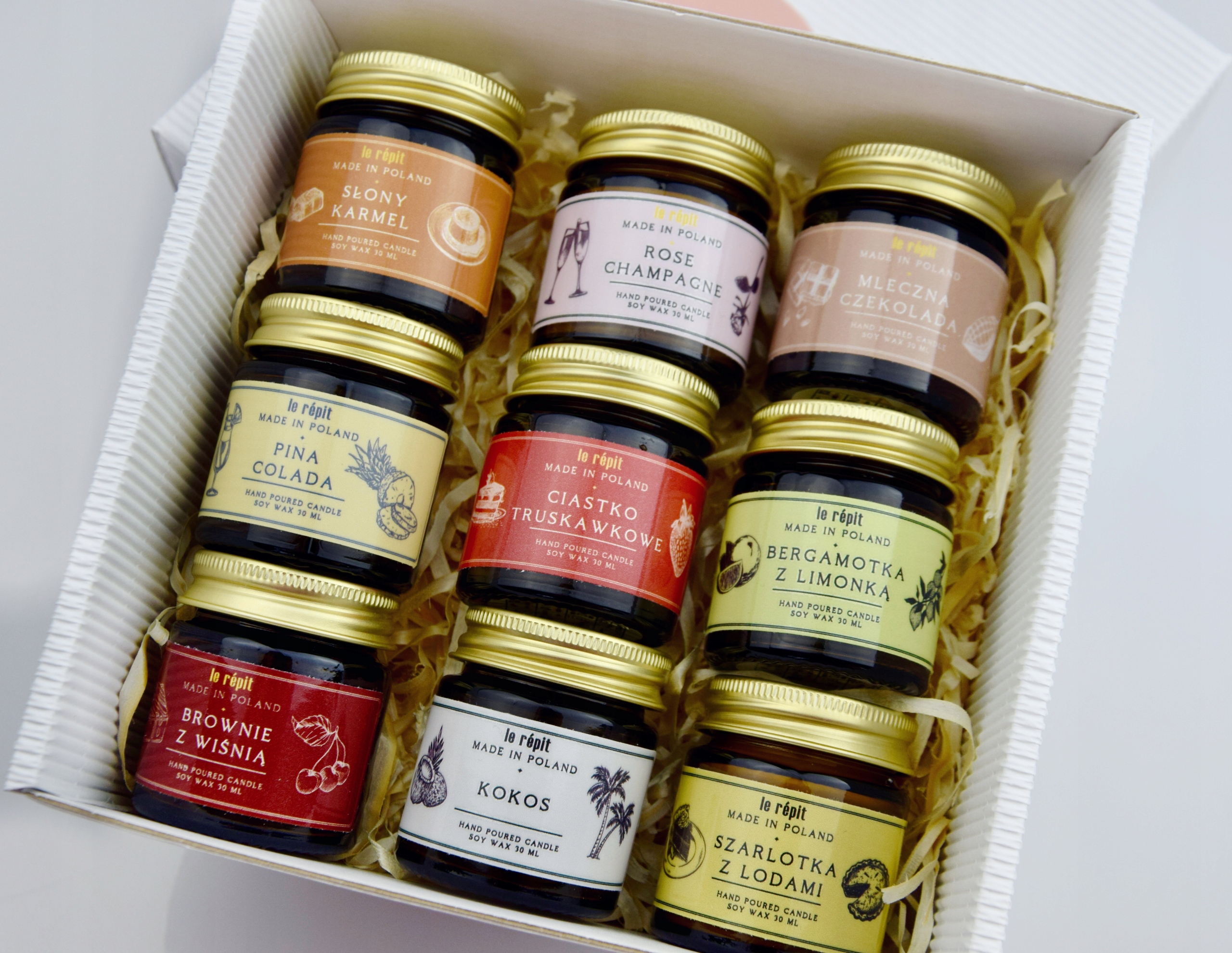 Набір соєвих свічок: трояндовий шампанське, яблучний пиріг з морозивом, полуничним тортом, кокосовим горіхом, молочним шоколадом, вишневим брауні, солоною карамелею, баргамотом з вапном, Pina Colada 9 x 30 мл. Рука зроблена