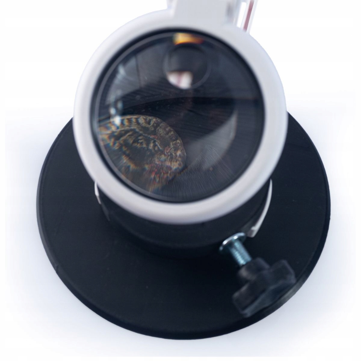 - Конструкція лупи базується на використанні 3 петель, що з’єднують кронштейни з самою лупою та підставкою. Кожна петля має незалежне регулювання кроку, що дозволяє регулювати висоту збільшувального скла відповідно до об’єкта, який розглядається.