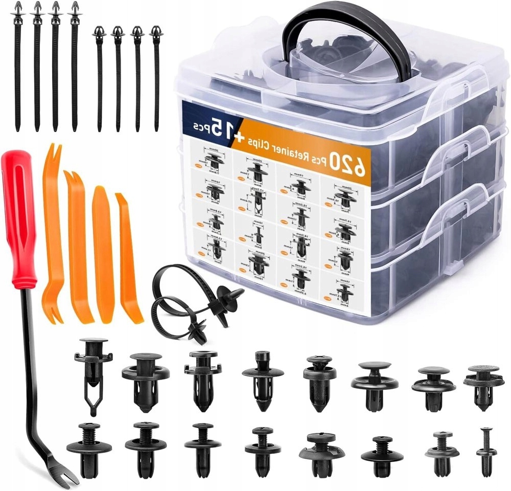 набір манжети автомобіля містить 620 елементів у популярних розмірах, що робить його неоціненним інструментом у кожній майстерні чи гаражі. Організатор 3-рівня з спеціалізованими відсіками дозволяє ретельно сортувати манжет, що полегшує їх зберігання та швидкий доступ під час роботи. Крім того, набір оснащений 5 інструментами для розбирання, що дозволяє легко та безпечно зняти старі манжети без ризику пошкодження оббивки чи інших елементів.