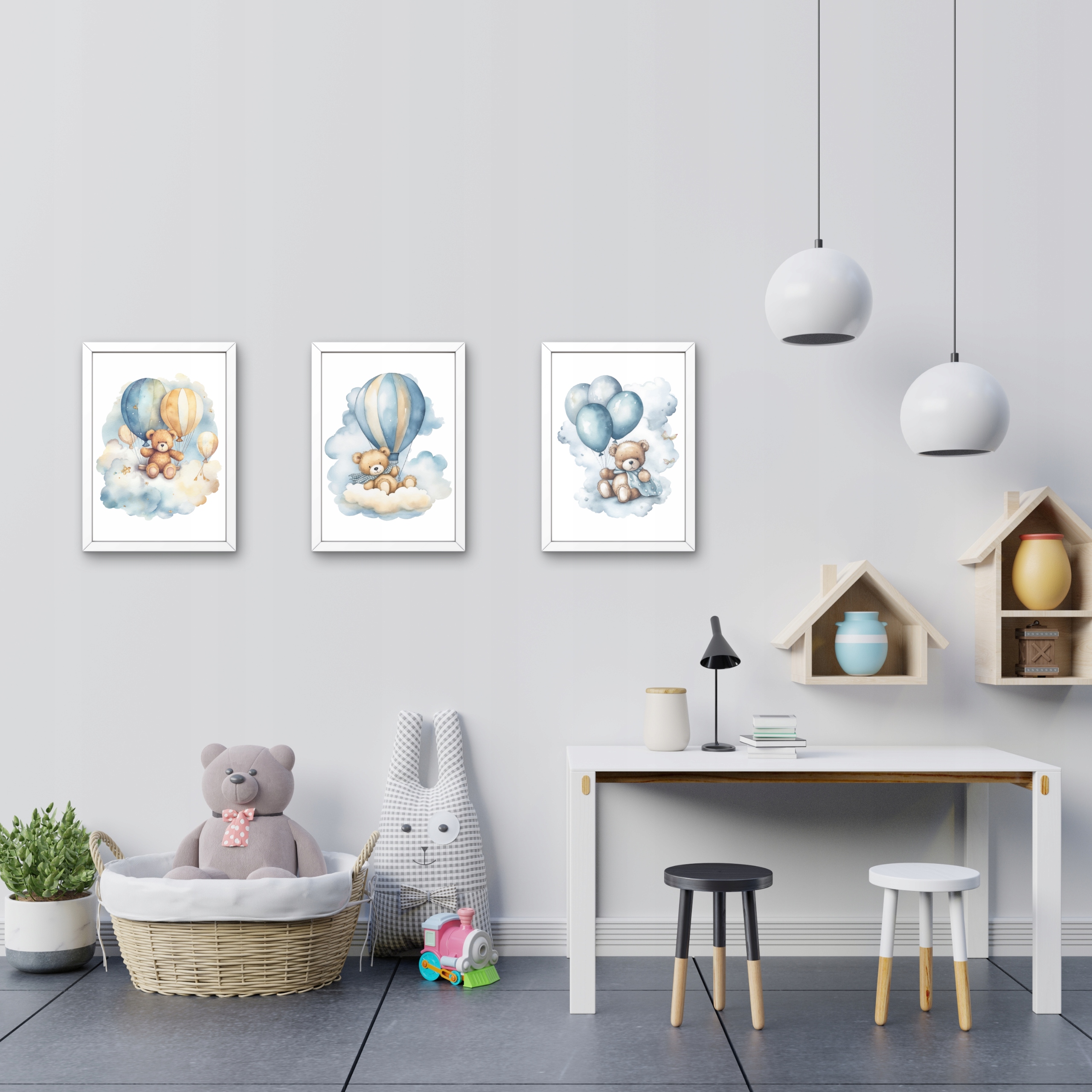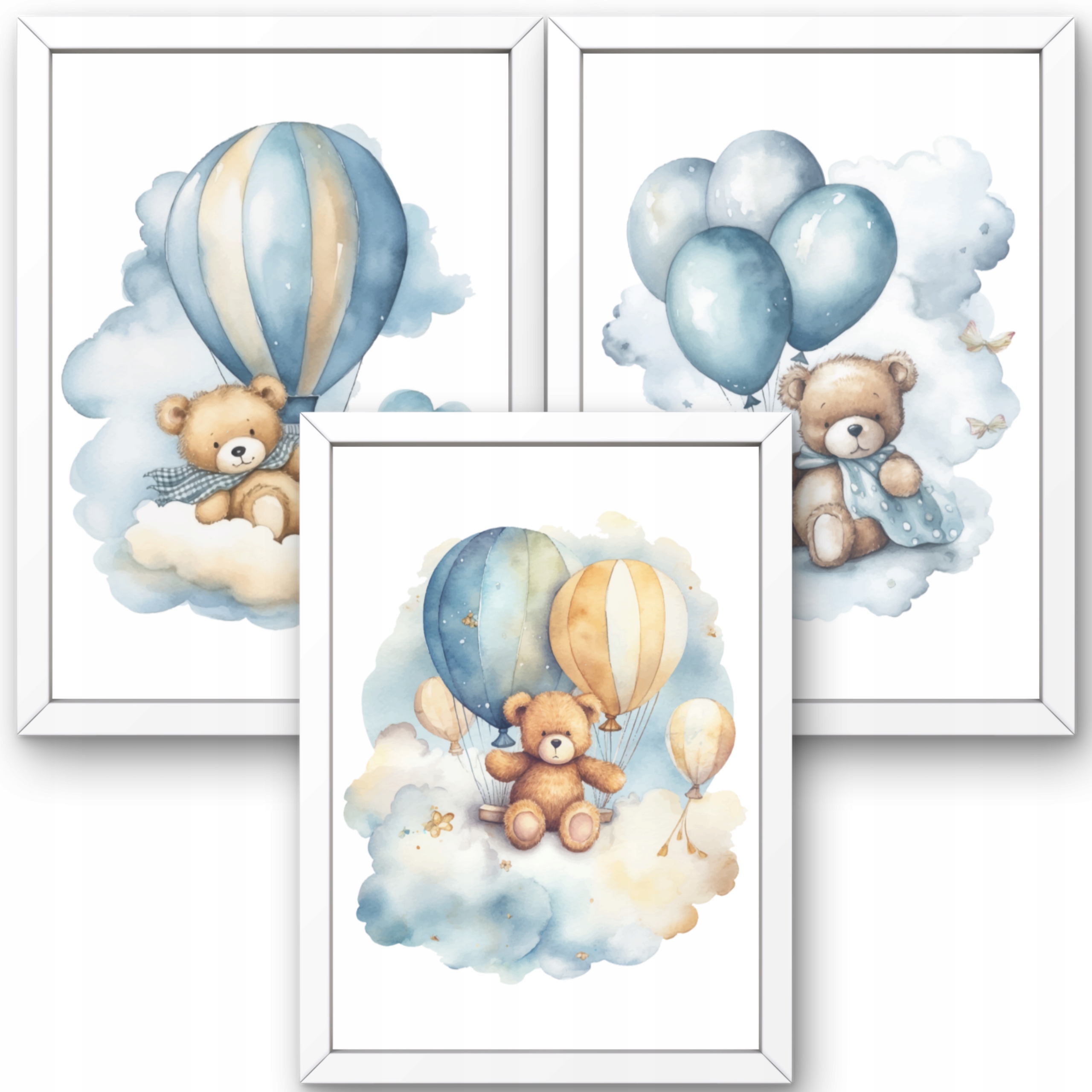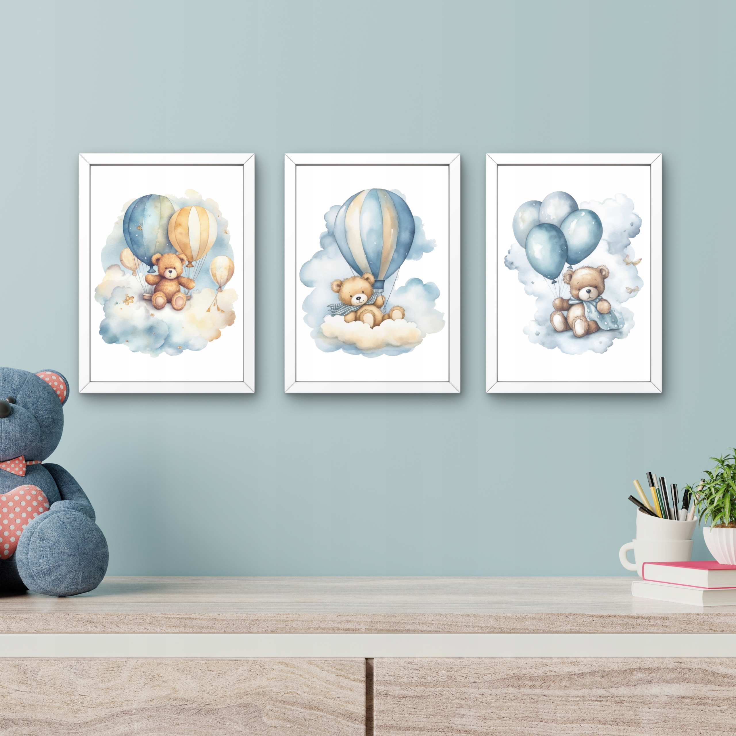 Картини для дитячої кімнати, 3 пастельні постери, ведмедики, повітряні кульки