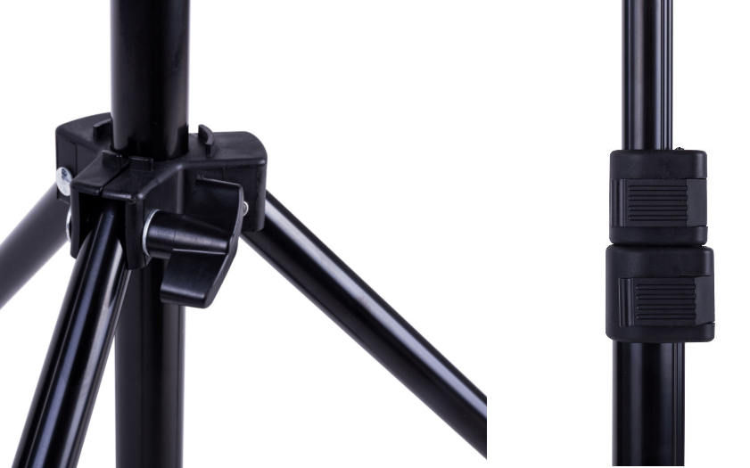 Штатив має універсальне кріплення (так звана грибоподібна голова), що дозволяє використовувати широкий асортимент студійних аксесуарів і ламп різних виробників. Його невеликий розмір у складеному вигляді робить його ідеальним для портативної фотостудії, штатив є важливим інструментом для подорожей на природі та роботи в студії.