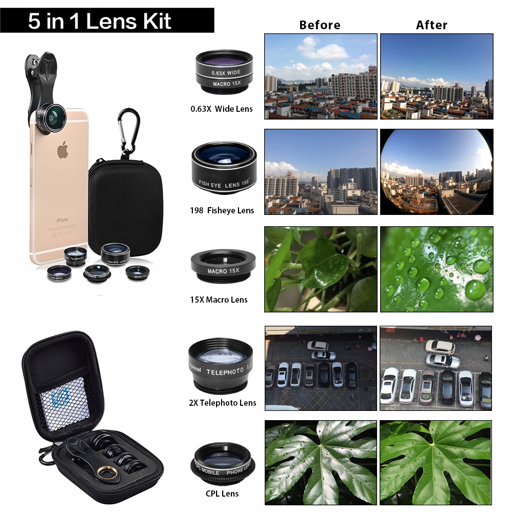Набір із 5 телефонних об’єктивів — те, що повинен мати кожен шанувальник мобільної фотографії. У футлярі ви знайдете лінзи, які підходять для будь-якої ситуації. Вони стануть у нагоді як у подорожах, так і під час заходів, портретних сесій, у лісі чи під час фотографування їжі. Високоякісні лінзи мають антиблікове покриття, яке забезпечує чітке та чітке зображення та ідеально відбиває кольори. Лінзи є надзвичайно універсальними та можуть використовуватися з більшістю телефонів, планшетів та інших мобільних пристроїв.