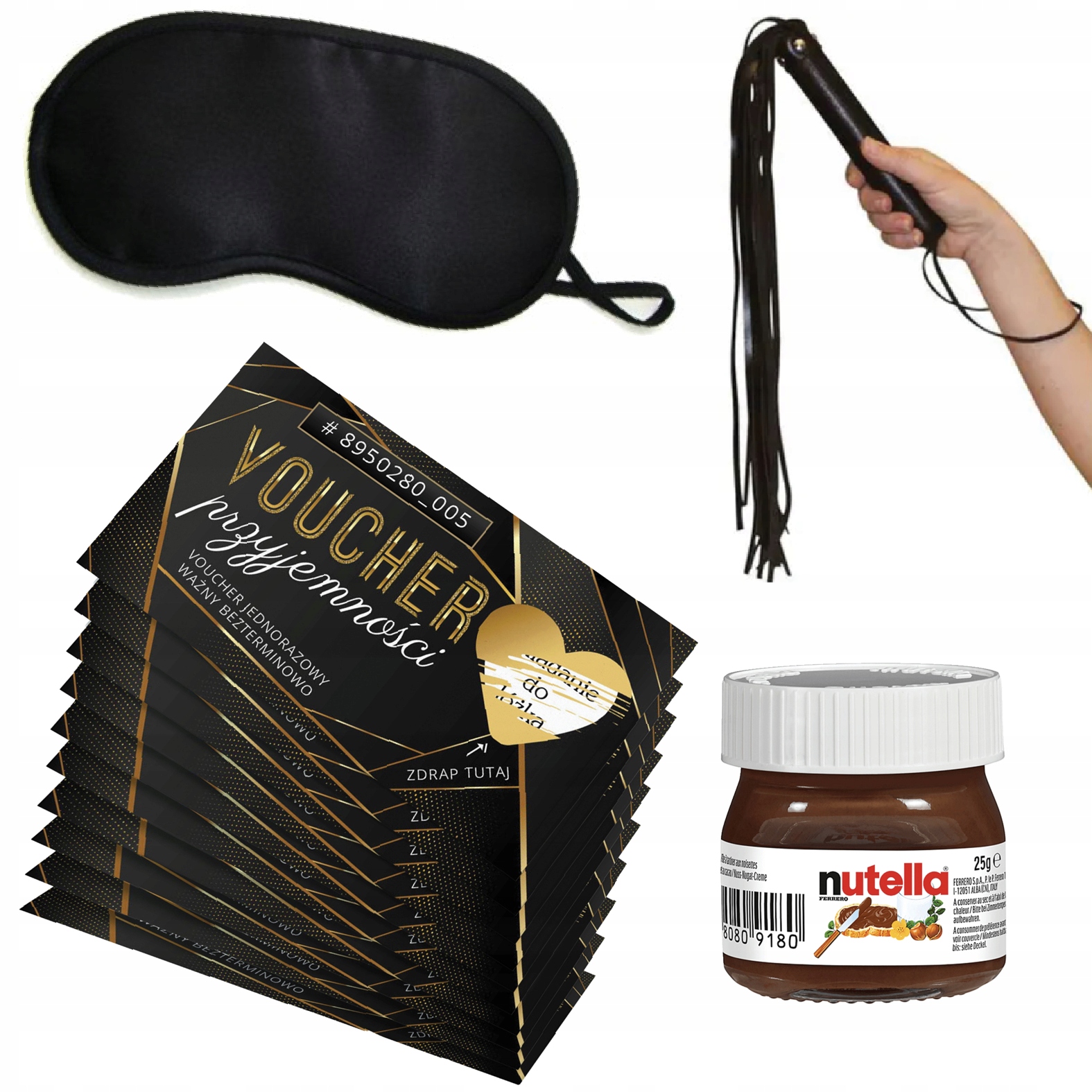 НАБІР ДЛЯ КОХАННЯ ДЛЯ ПАРИ ПОДАРУНКОВИЙ ВАУЧЕР + ГНІТ + ПОВ'ЯЗКА НА ГОЛОВУ + NUTELLA