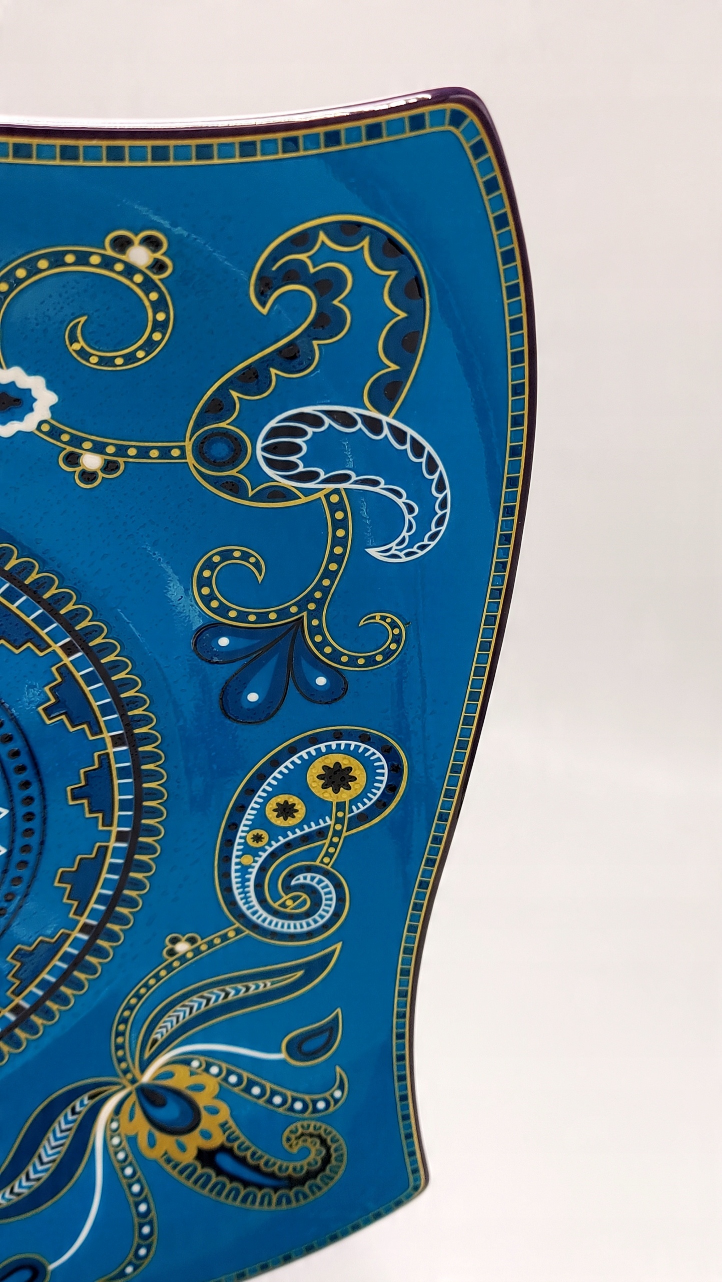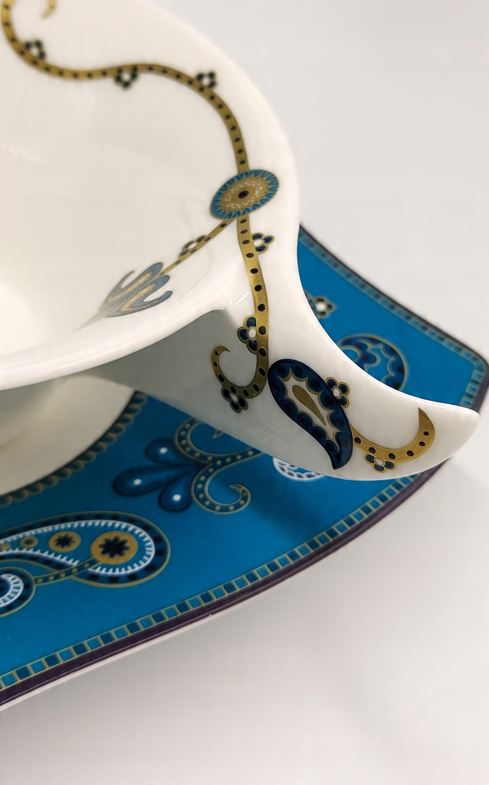 Порцеляна Samarah Turquoise — ще одна серія, що доповнює східну колекцію Samarah. Оригінальні, хвилясті форми преміальної порцеляни, багато прикрашені золотим орнаментом, які цього разу поєднані з інтенсивним бірюзовим кольором, що підкреслює екзотичний характер колекції. Натхнення тут черпалося з індійської культури. Samarah відноситься до найпотужнішої нині тенденції в Європі, а саме черпання натхнення з індійської культури та традицій. Набір візуально порадує кожного. Ідеальний подарунок для любителя незвичайних рішень і неймовірно художньої порцеляни. Підпис внизу.