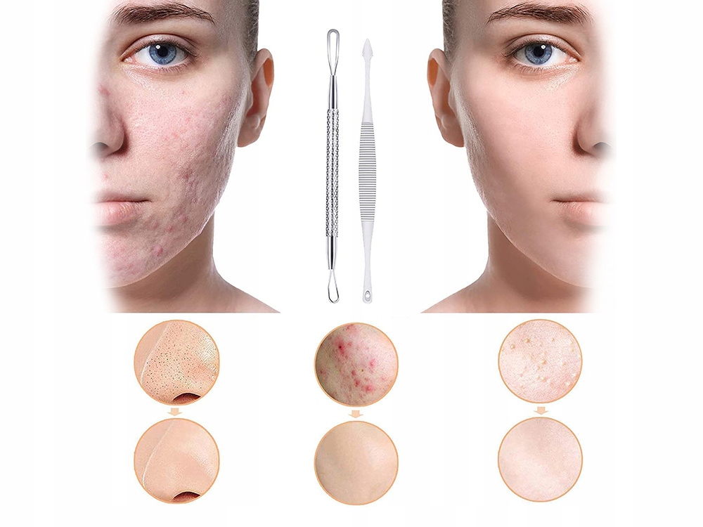 Видаліть чорні крапки або чорні крапки, застосовуючи відповідний тиск, щоб чорні крапки або чорні крапки опинилися всередині - ми обережно натискаємо на шкіру, що призведе до того, що чорні крапки або вугри будуть видавлюватися вгору. Скобка використовується для проколювання більших пошкоджень.