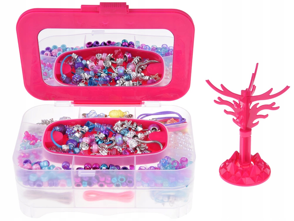 - Набір намистин для виготовлення власного унікального браслета чи намиста подарує кожній дівчині масу позитивних занять. Дівчата, які люблять ручну роботу, знайдуть у такому наборі багато натхнення для створення власних прикрас. І, звичайно, кожна прикраса, яку ви зробите самостійно, буде унікальною. У набір входить прозорий пластиковий футляр з відділеннями і дзеркалом, в якому можна зберігати невикористані аксесуари для виготовлення прикрас і готові прикраси. Завдяки ручці чохол можна легко перенести в інше місце. Коробка складається з двох елементів, щоб розгорнути коробку, після відкриття кришки поверніть два рожеві захисні пристрої всередині коробки. Шкатулка точно виглядатиме красиво в кімнаті маленького ювелірного дизайнера з прикріпленою рожевою підставкою для прикрас у формі дерева. Підставка ідеально підійде для демонстрації ваших унікальних браслетів, якими зможуть милуватися всі.