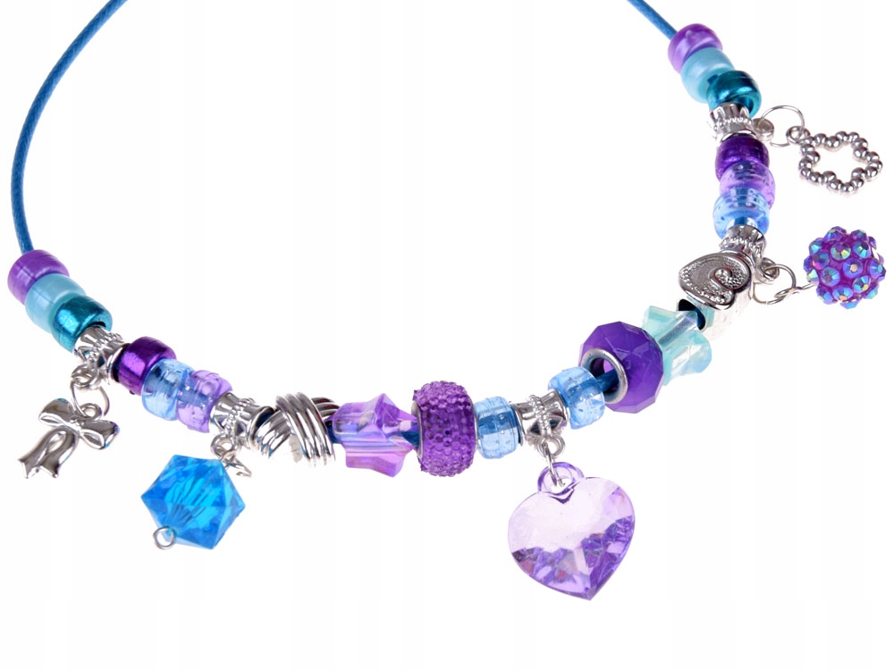 - У набір входить: - 2 металеві браслети для протягування - 3 воскові нитки із застібками (рожевий, блакитний, фіолетовий) - 2 нитки (блакитна, неоново-рожева) - 2 ремінці (бежевий, рожевий) - намистини - підвіски, шарми - скриня - підставка для прикрас