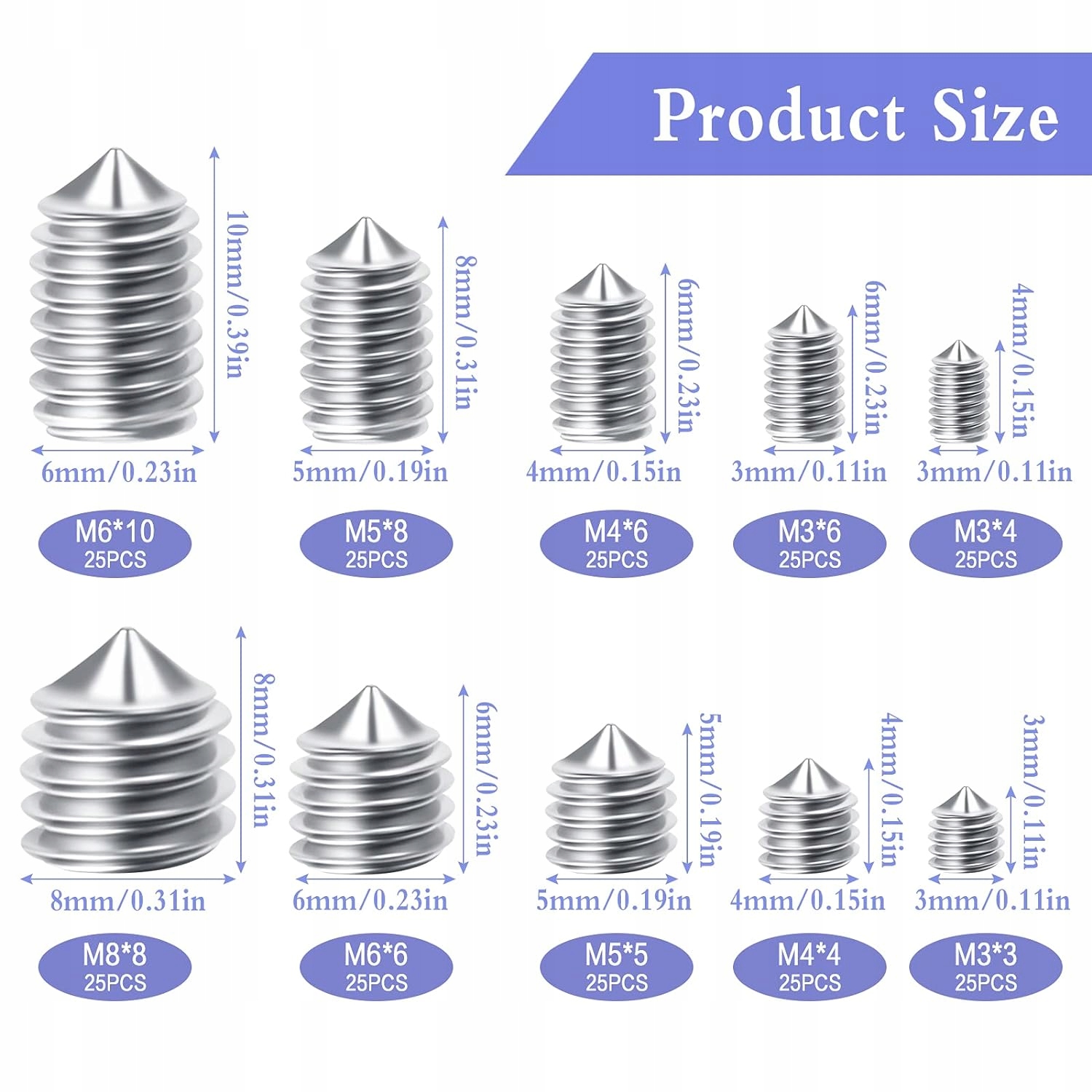 Наш набір установочних гвинтів містить гвинти 10 різних специфікацій, що дозволяє адаптувати їх до ваших індивідуальних потреб. Гвинти з шестигранним шестигранником із нержавіючої сталі різних розмірів можна використовувати для багатьох цілей.