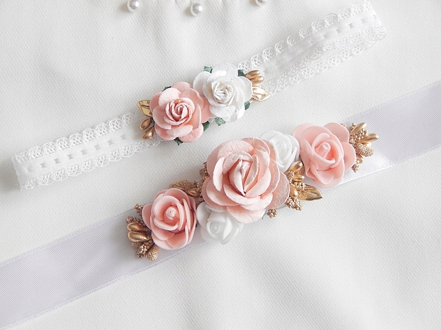 пов'язка на голову на декоративній білій еластичній, прикрашеній ніжними квітами. Його схема в незаконному стані становить близько 36 см