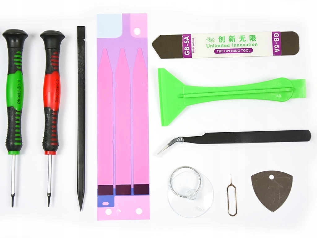 Великий набір інструментів, які використовуються під час ремонту електронних пристроїв. Елементи, що входять до комплекту, полегшують розбирання/збирання пристрою без пошкодження корпусу. Хрестик, Pentalobe 0.8, TRIWing 0.6, 4 відкривачки, всмоктуюча насадка, пінцет, ключ, акумуляторний КЛЕЙ.