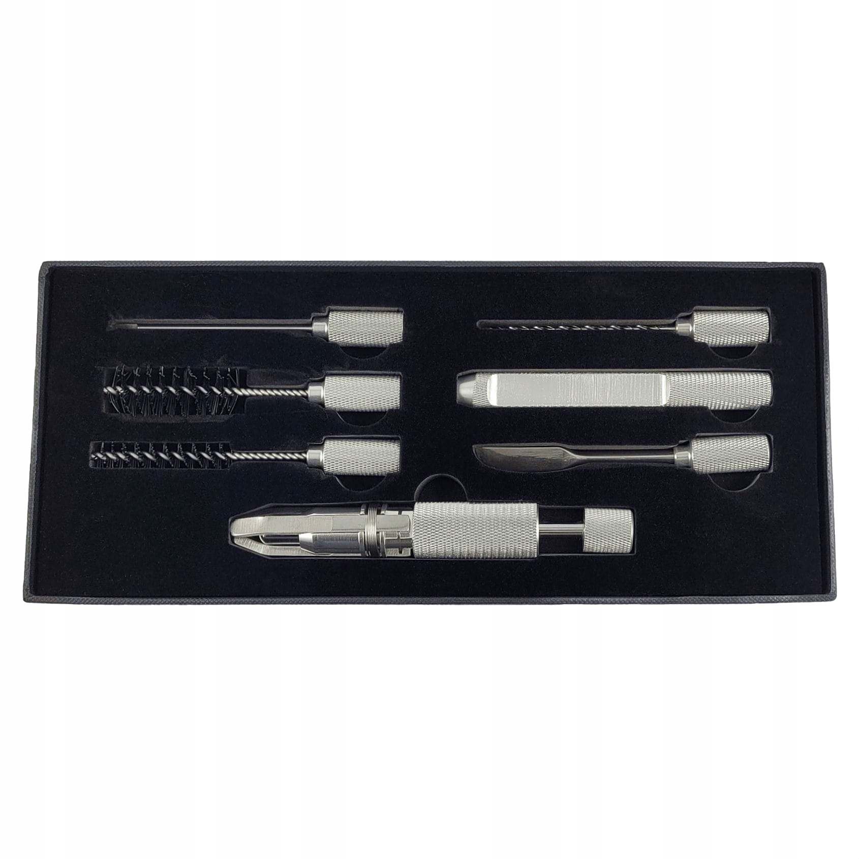 Професійний набір аксесуарів для догляду та підтримки труб у справному стані. У набір входять: регульована фреза з робочим діапазоном від 17 мм до 22 мм, два жорстких очисних стрижня різного діаметру, свердло, скребок, вантуз і трамбовка. Набір неодмінно стане в нагоді кожному курцю трубки, а також може стати вишуканим подарунком.
