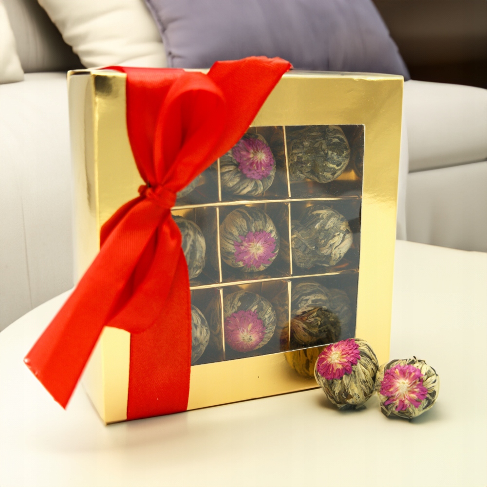 Набір квітучих чаїв 9 ПК. чаю). Кожен з цих чаїв - це незабутній смак, а унікальні ароматні ноти. Чай Це листя білого або зеленого чаю, що переплітаються у вишуканій формі або просто кулі. Після затоплення м'яча гарячою водою структура починає змінюватися в прекрасну, екзотичну квітку. Отримана інфузія має делікатний, прозорий колір, завдяки якому квітка процвітає в глечиці.