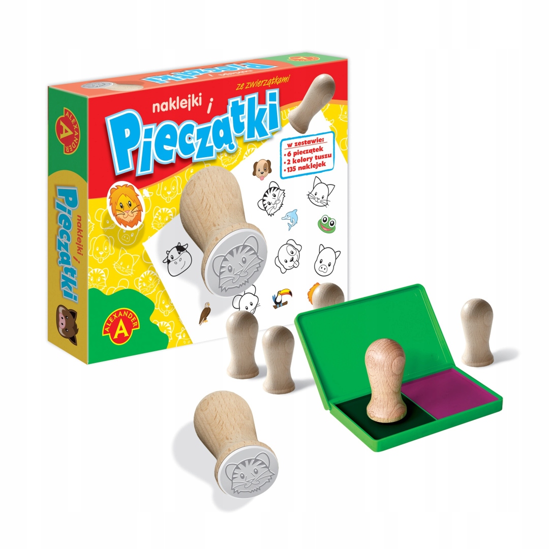 творчий набір для дітей, що складаються з 6 марок з візерунками тварин (кошеня, собаки, миші, поросят, тигра, корови), які можуть бути відбиті на чорній та червоній подушці у спеціальній пластиковій коробці. Відбиті фігури можна забарвити олівцями або додатково прикрасити свої малюнки з ними. 135 барвисті наклейки диверсифікують задоволення. Усі елементи знаходяться в елегантному, функціональному формуванні. 100% польський продукт, виготовлений повністю на фабриці Олександри.
